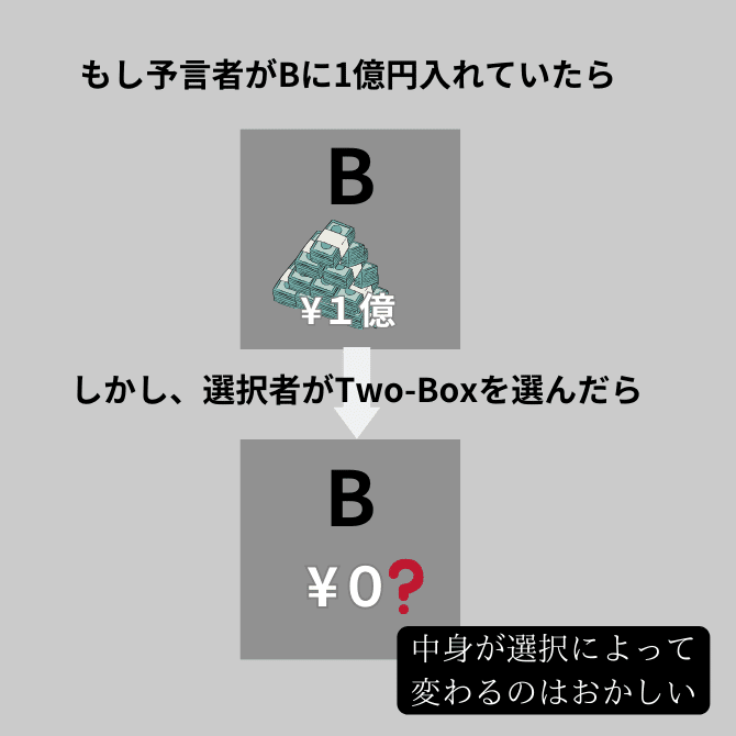 しかし、One-Boxerの主張を鵜呑みにするなら、Bだけと予言したにも関わらず先にAを開けたならBの中身(1億円)がどこかへ消えてしまう*²。(たとえば予言がOne-Boxerで選択がTwo-BoxerならBには1億円が、予言がTwo-Boxerで選択がOne-BoxerならBには0円が入っていることになりあなたの選択によって箱の中身が変わっているとわかるからだ)