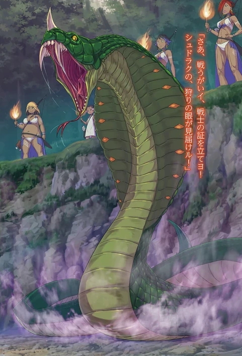 The Elgina (エルギーナ, Erugīna) is a snake witchbeast with a ten-meter-long body in length, green scales, a torso as thick as a bundle of logs, and a tail powerful enough to cause fatal injuries with a mere graze. It also produces a poison that is easily capable of killing at least a full-grown man, and like regular snakes, it uses a pit organ to see with heat vision. According to Vincent Vollachia, "El" means giant, so Subaru deduces that "gina" means snake.