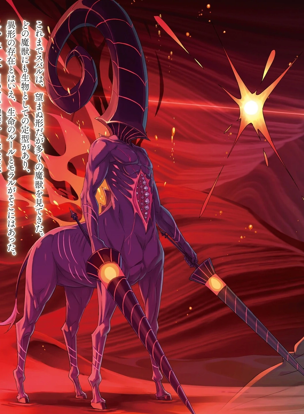 Hungry Horse Kings (餓馬王, Gabaō), dubbed Centaurs (ケンタウロス, Kentaurosu) by Natsuki Subaru, are an endemic species located underground in the Augria Sand Dunes and are one of the strongest species that live there. They are six to seven meters in length. They are described to be similar to a deformed centaur: they have the body of a horse with a humanlike torso instead of a head, the human torso in turn has a curved horn growing where the head should be and a mouth stretching vertically from chest to belly, with no eyes, and a cry similar to a human baby's. In exchange for not having sight, their hearing is above average, using echolocation to see their surroundings. The fur on their back is constantly burning and keeps on burning even if it is pulled out, allowing them to launch fireballs at their prey or create weapons for close combat.