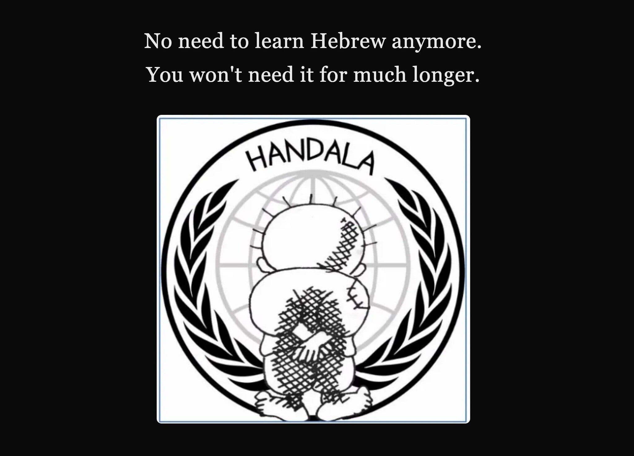 The page is illustrated with “Handala,” a symbol of Palestinian resistance. The character was created by Palestinian newspaper cartoonist Naji al-Ali in 1969 and is widely used by the Palestinian national movement.
