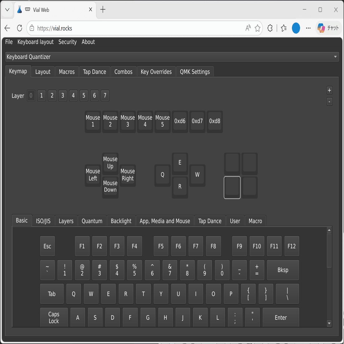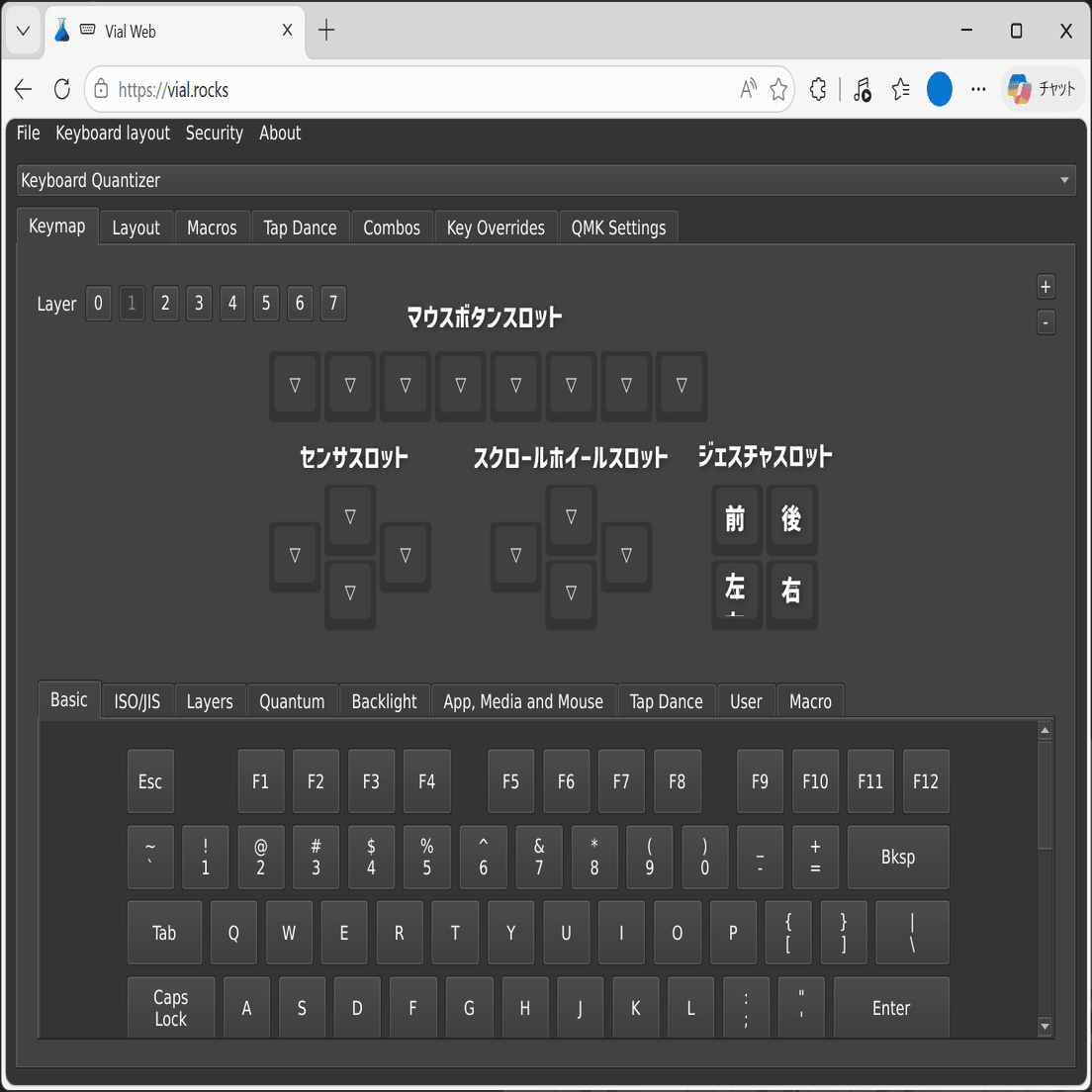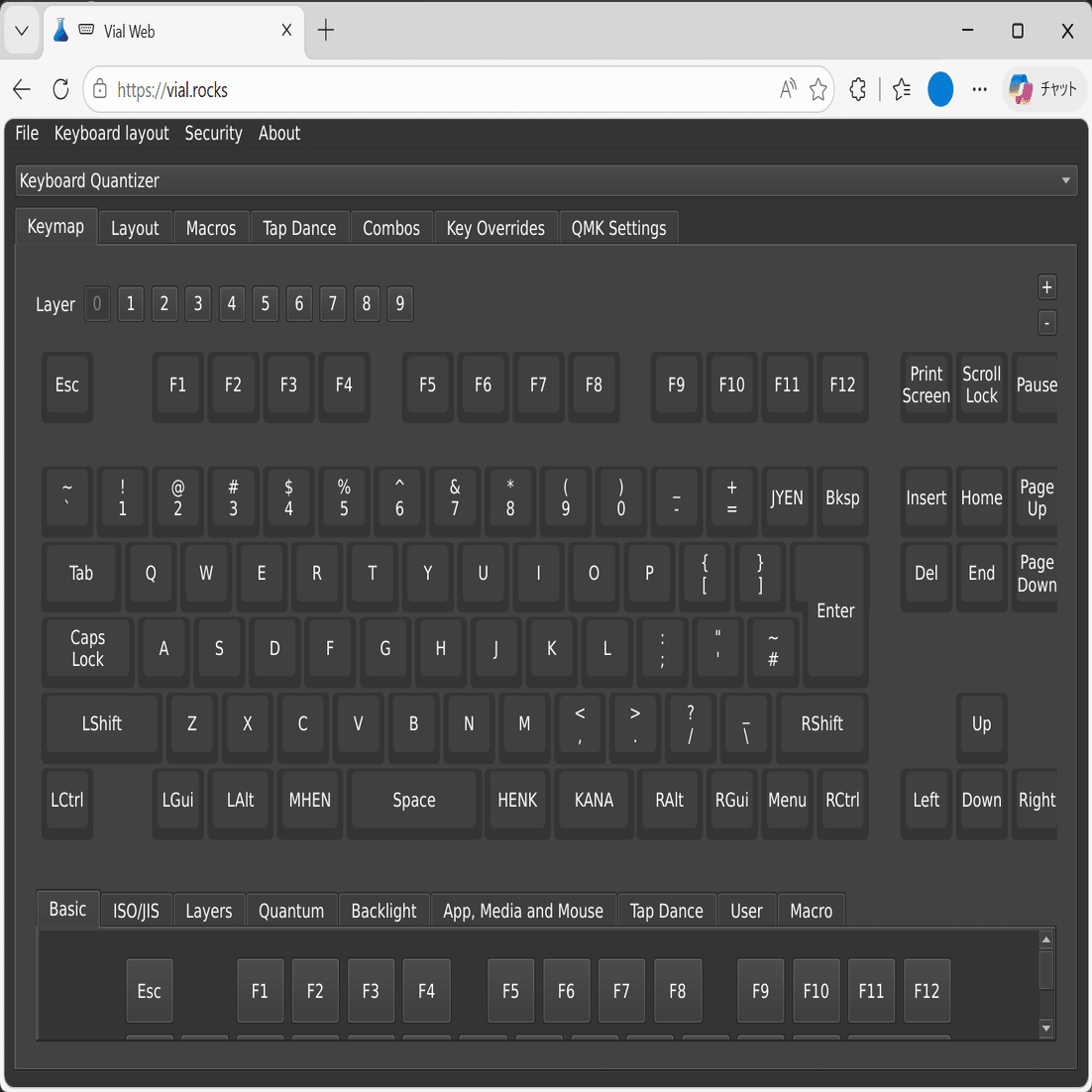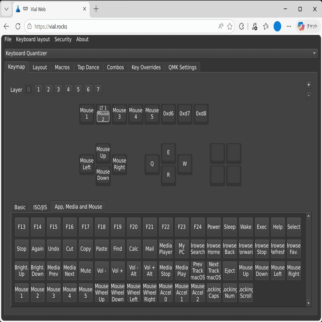 KQMを介してPCに接続したデバイスは、QMKファームウェアデバイスのリマップWebアプリとして有名なVial・Remapにてボタン等のリマップが可能となります。