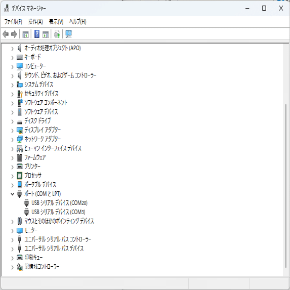 → COMポートが正しいか確認してください。デバイスマネージャーで「ポート(COMとLPT)」を見るとKQMのCOMポート番号が確認できます。