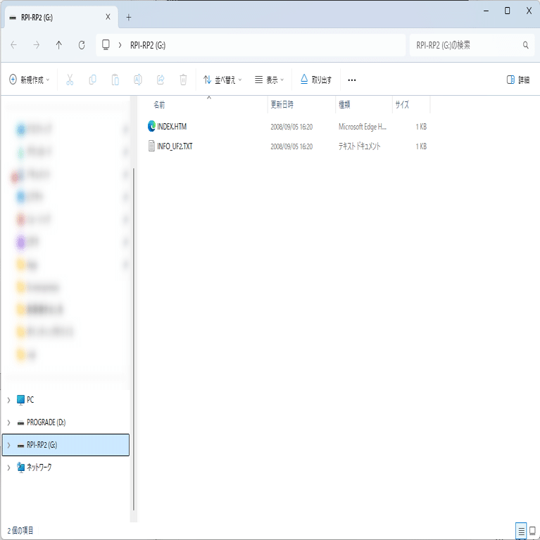→ uf2の書き込みが正常に完了しているか確認してください。RPI-RP2 ドライブへのドロップ後、自動的にドライブが消えて再接続されれば成功です。
