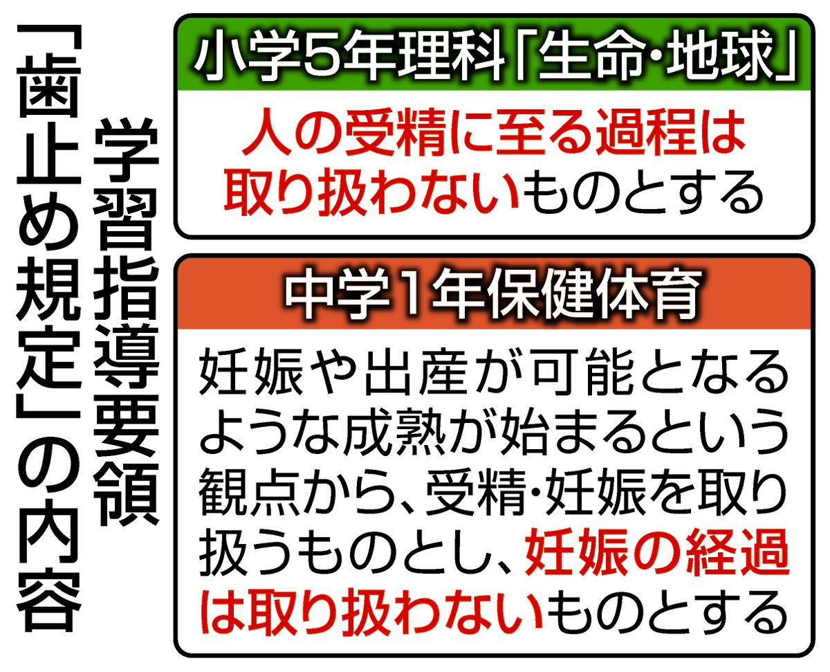 歯止め規定は1998年に設けられた。小5理科の「動物の誕生」を教える際に「人の受精に至る過程」について、また中1保健体育の生殖に関する項目で「妊娠の経過(性交)」についてはそれぞれ「取り扱わない」と明示されている。