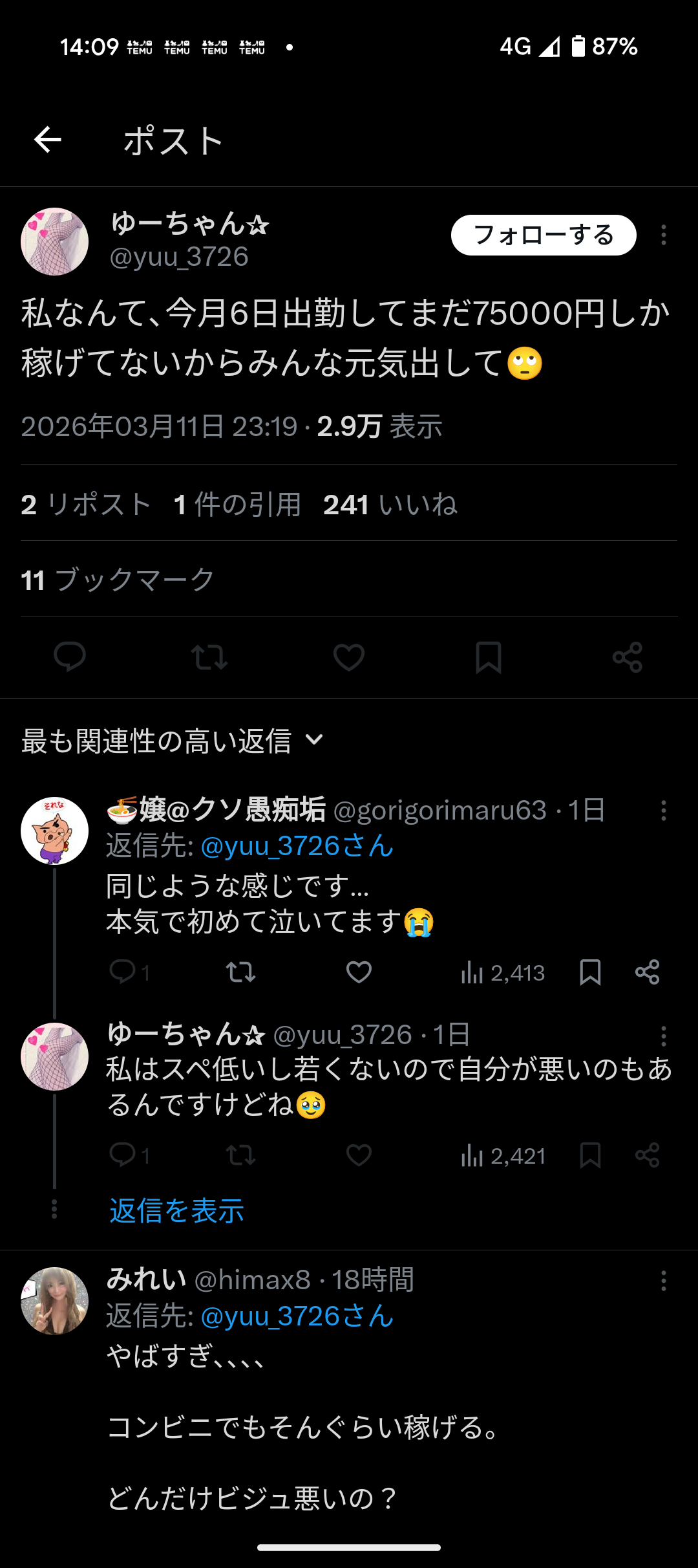 ご自身で6日出勤して75000円しか稼げて無いって書いてますやん🥴🥴