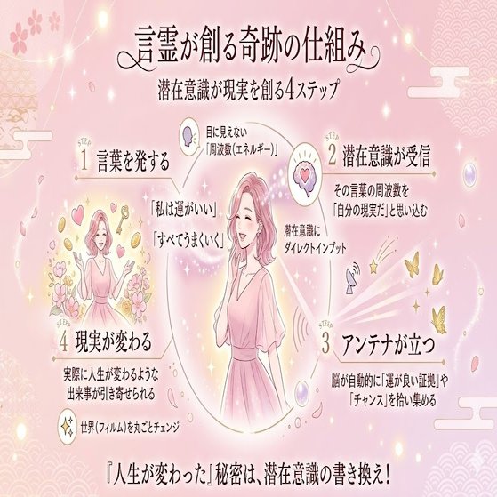 それは、言葉の持つエネルギー(周波数)を使って潜在意識を書き換え、望む現実を自ら創り出していく「引き寄せの法則」そのものなのです。