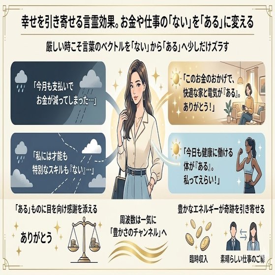 ③ 幸せを引き寄せる言霊効果。お金や仕事の「ない」を「ある」に変える言葉の選び方