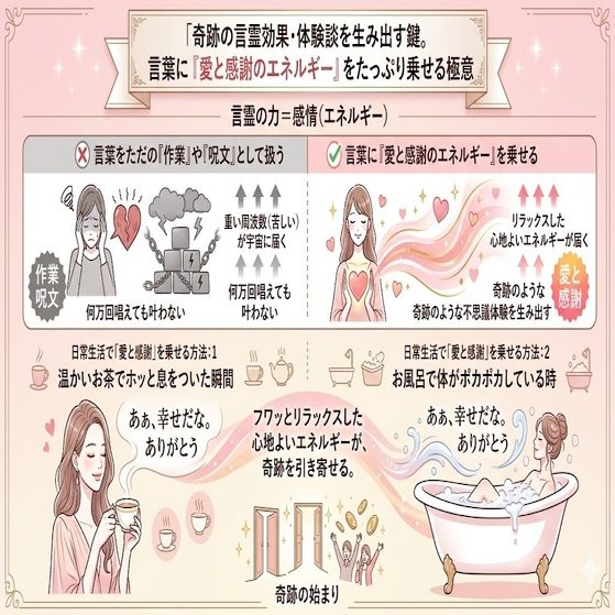 ⑦ 奇跡の言霊効果・体験談を生み出す鍵。言葉に「愛と感謝のエネルギー」をたっぷり乗せる極意