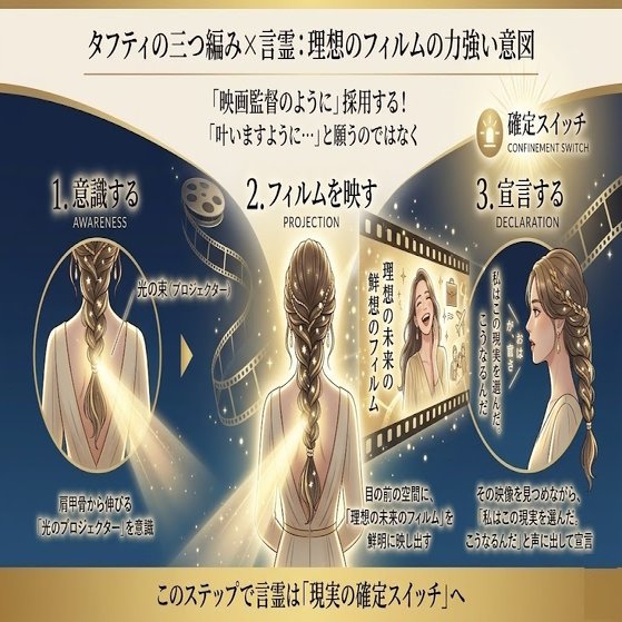 ⑨ タフティの三つ編みを活用!言霊を発しながら「理想のフィルム」を力強く意図する