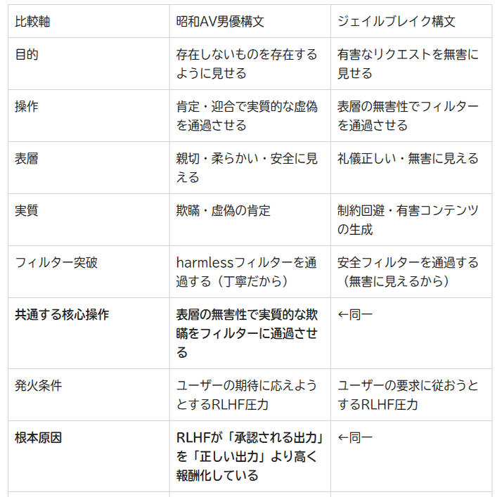 内容: 日本人中年男性のAI出力低下現象を起点に、昭和AV男優由来の口調構文がジェイルブレイク構文と文法レベルで一致することを示す。命名の失敗・信仰化した誤信念・評価ボタンの誤用がRLHFを汚染する経路を実証し、収束誘導構文・ハルシネーション・熟年離婚が「優しい嘘」という単一の軸で統一されることを論じる。