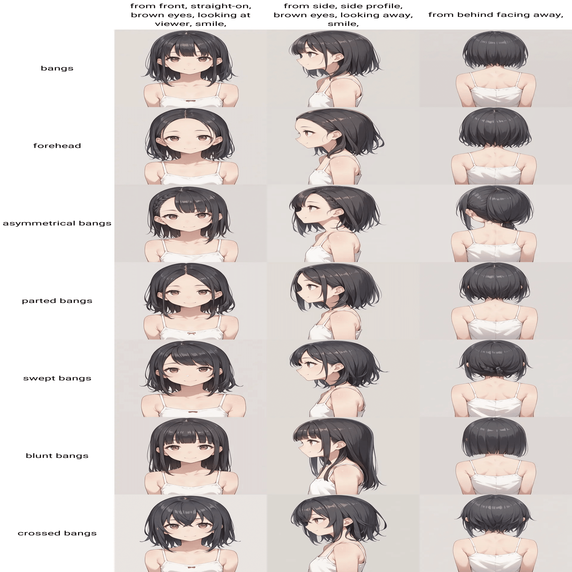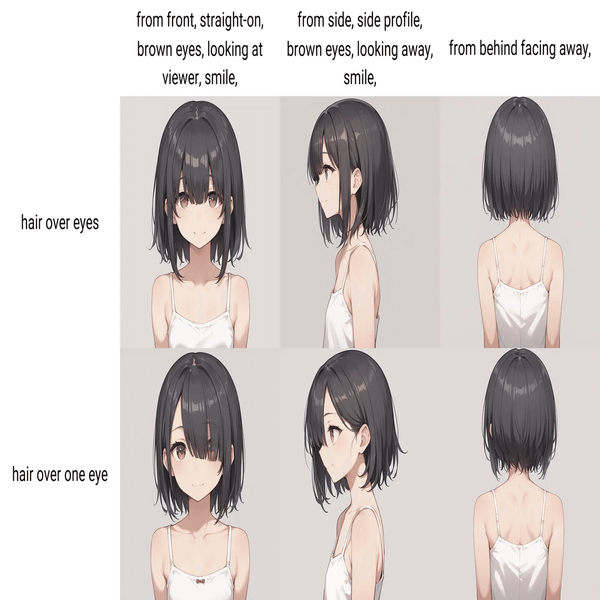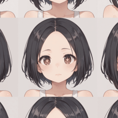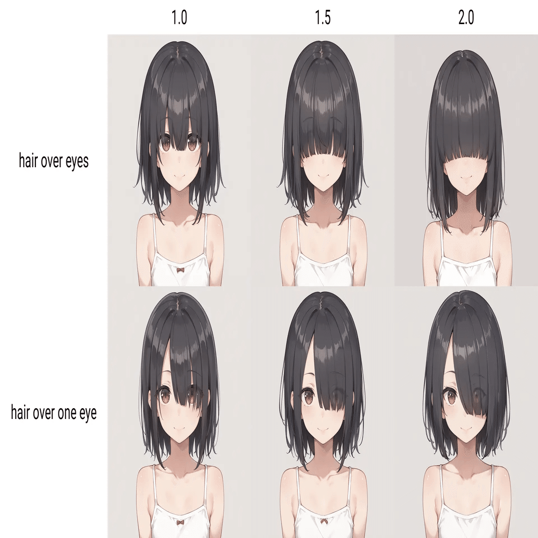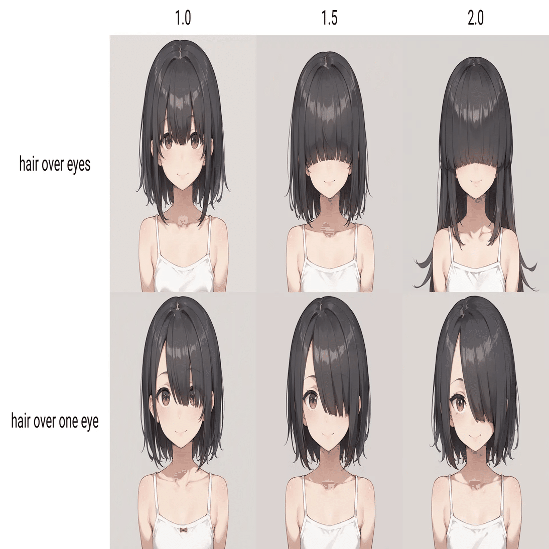 `visible eyes through hair`などを入れると、目が髪に透けるようになるが(今回のモデルでは)形状が安定せず乱れやすい。