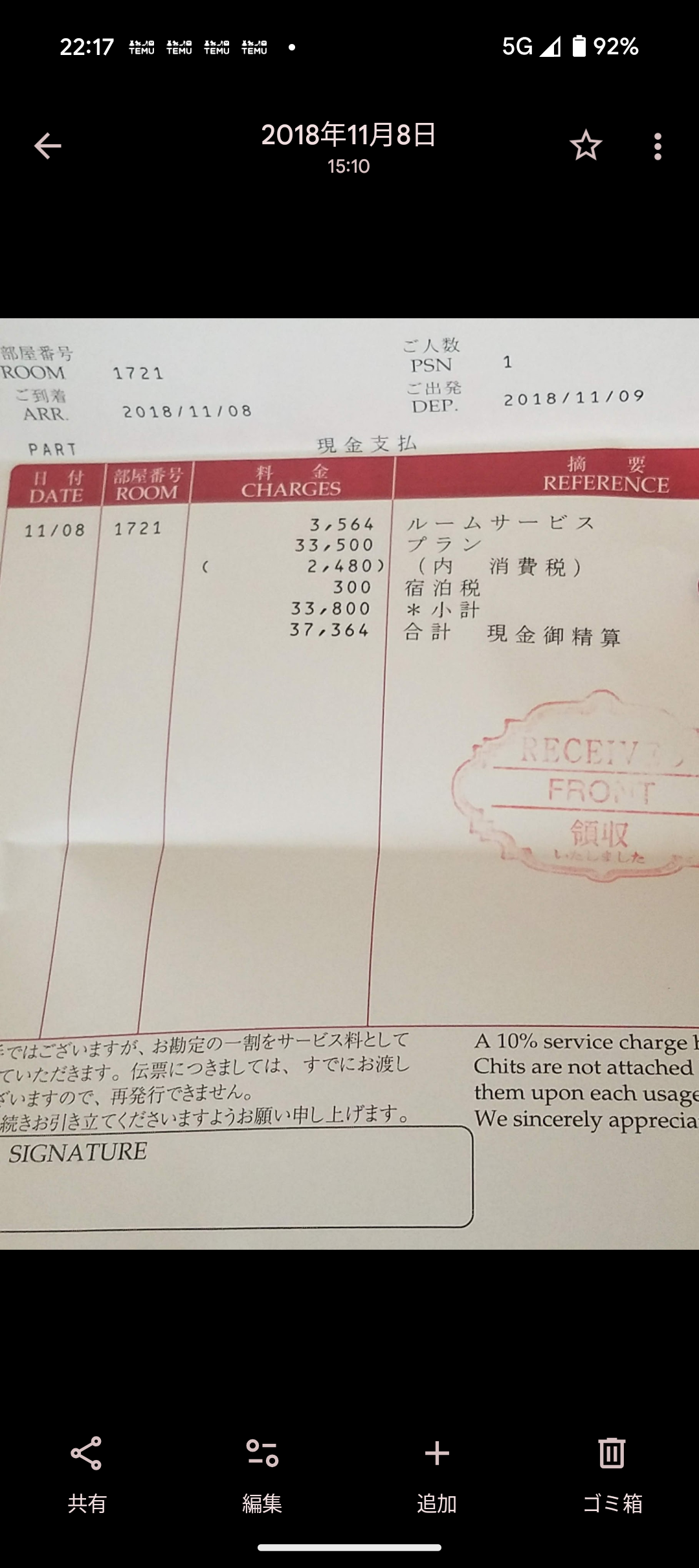 高級ホテルでの現金払いだからルームサービスの分も先払いですこれ。