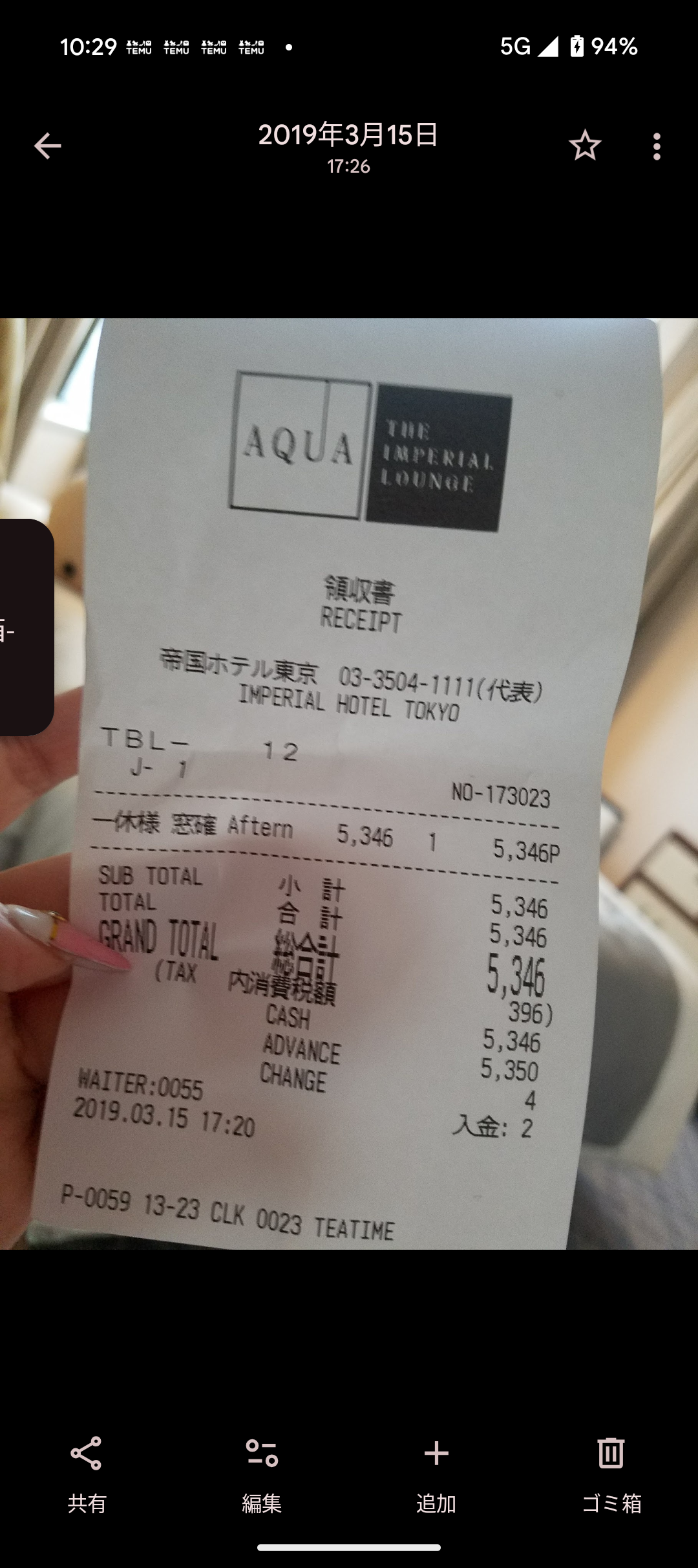 そして、7年前の今日、3月15日は帝国ホテル東京に泊まっていました。