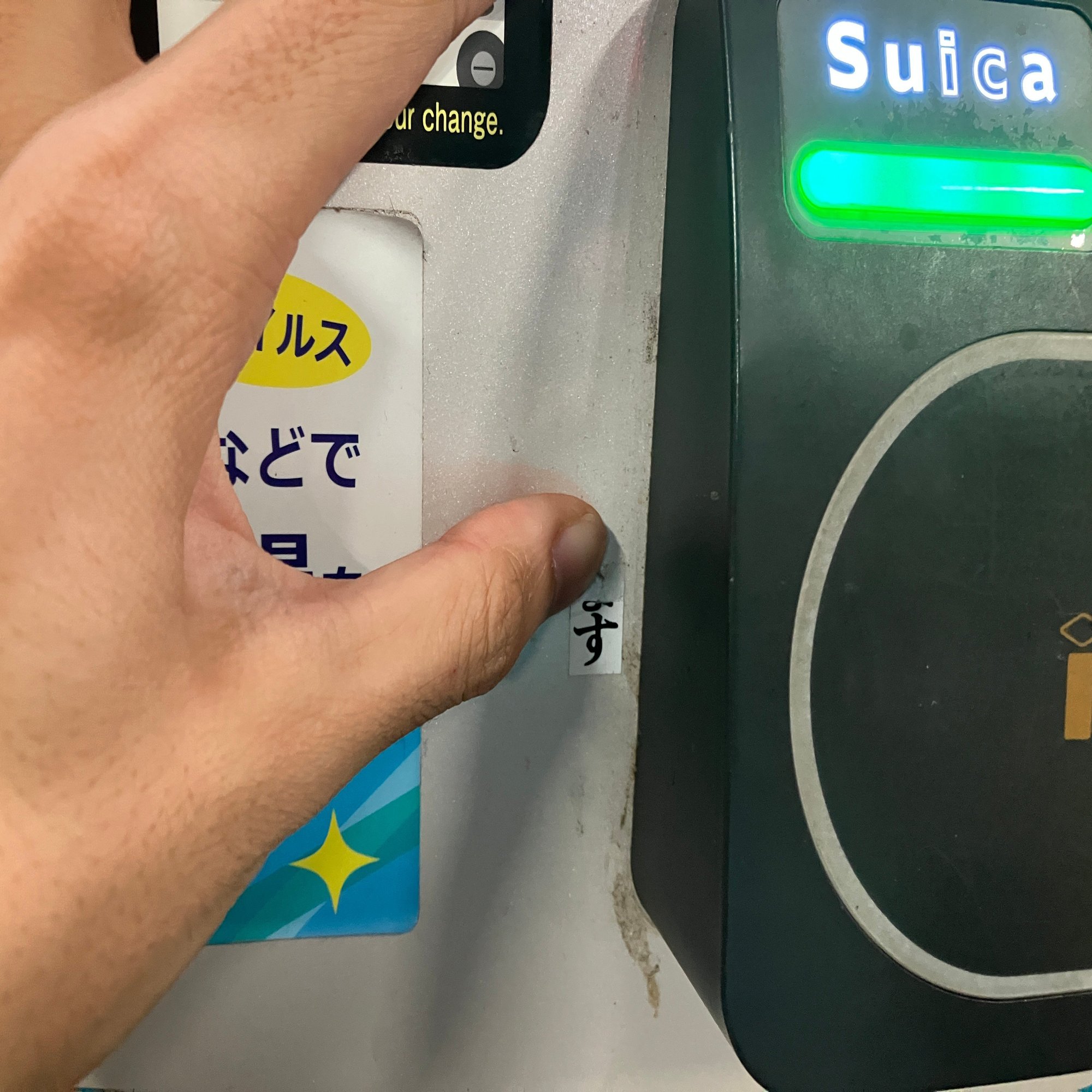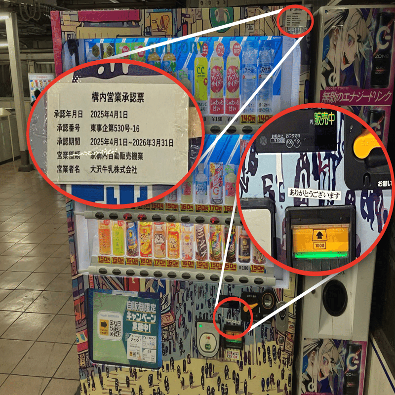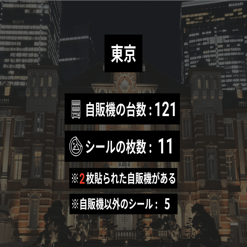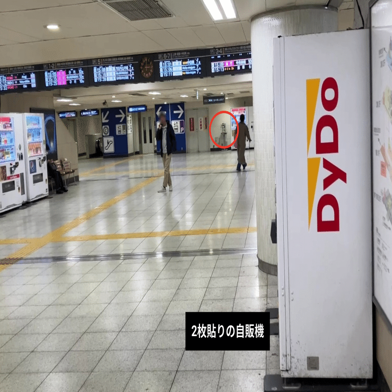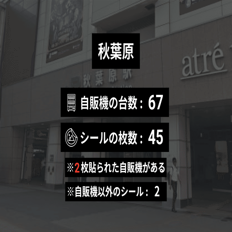 1時間ほど調べたところ、駅の外では自販機を80台見てもシールは1枚しかなかった。こうなるとなぜ1枚だけ貼られているのか気になってくる。外に出るならもっとたくさん貼りそうなのに。
