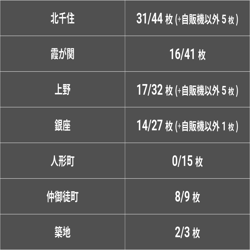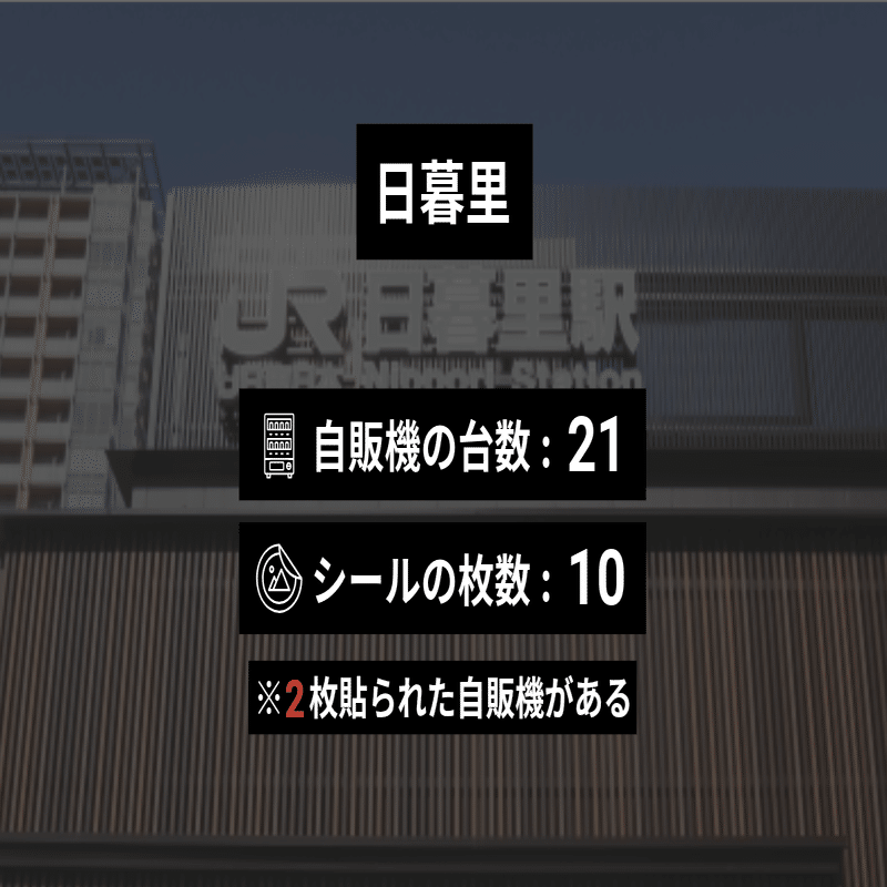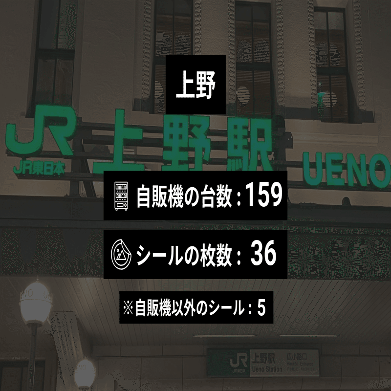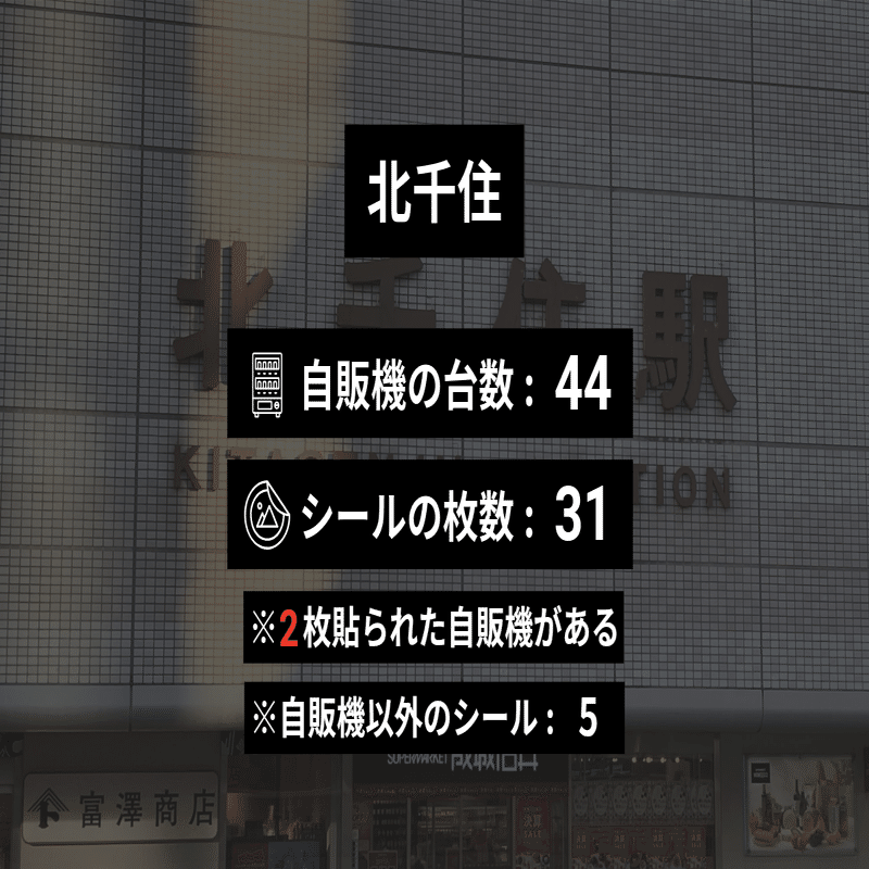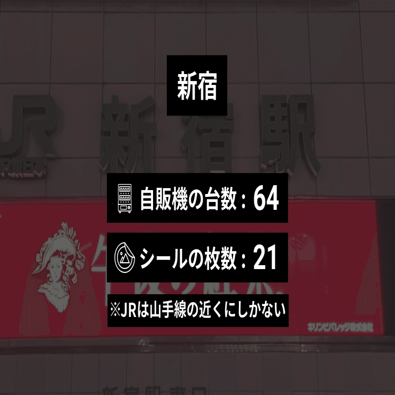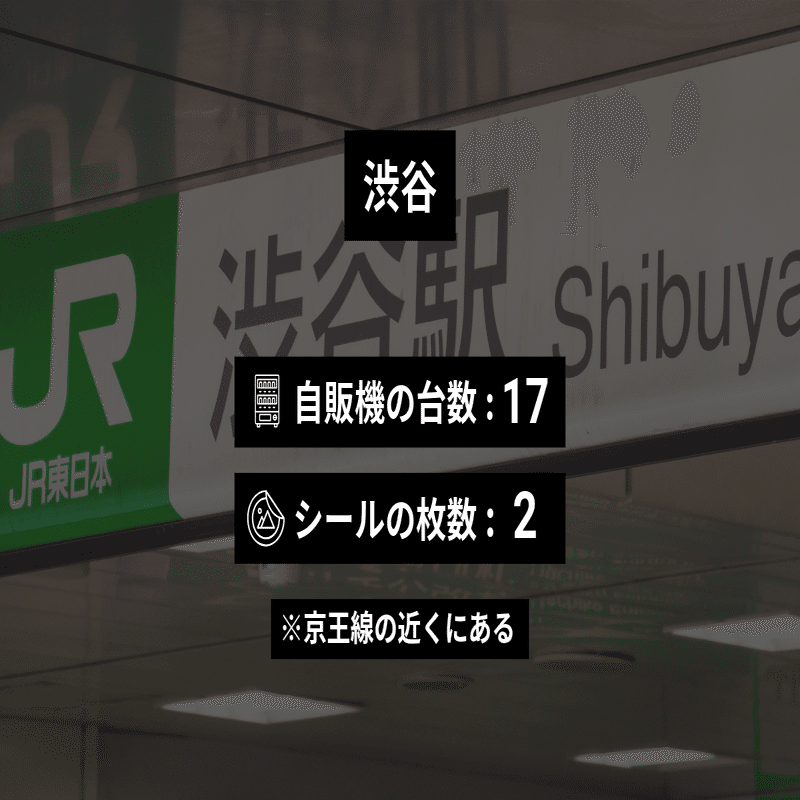 ※自販機の撤去や移動、シールがはがされたり新たに貼られたりしたために現在のデータとは異なっている可能性があります。また、すべての駅で本当に全部の自販機を調べたということは保証できないので、あくまで参考程度にご覧ください。