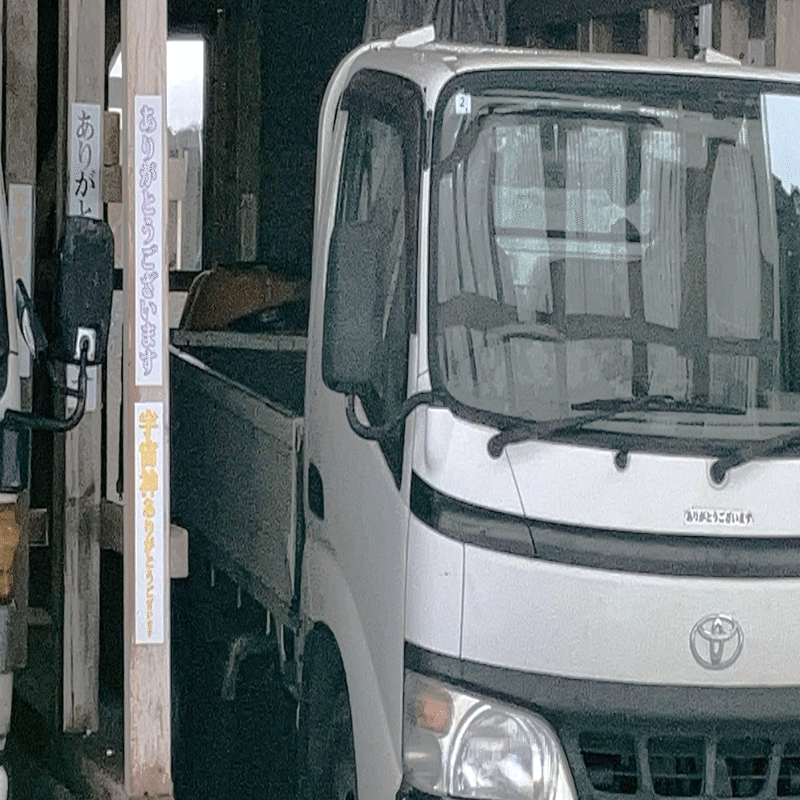 壁や柱、車などあらゆる場所に「ありがとうございます」が貼られている。貼れる場所にはすべて貼っているかのようだ。