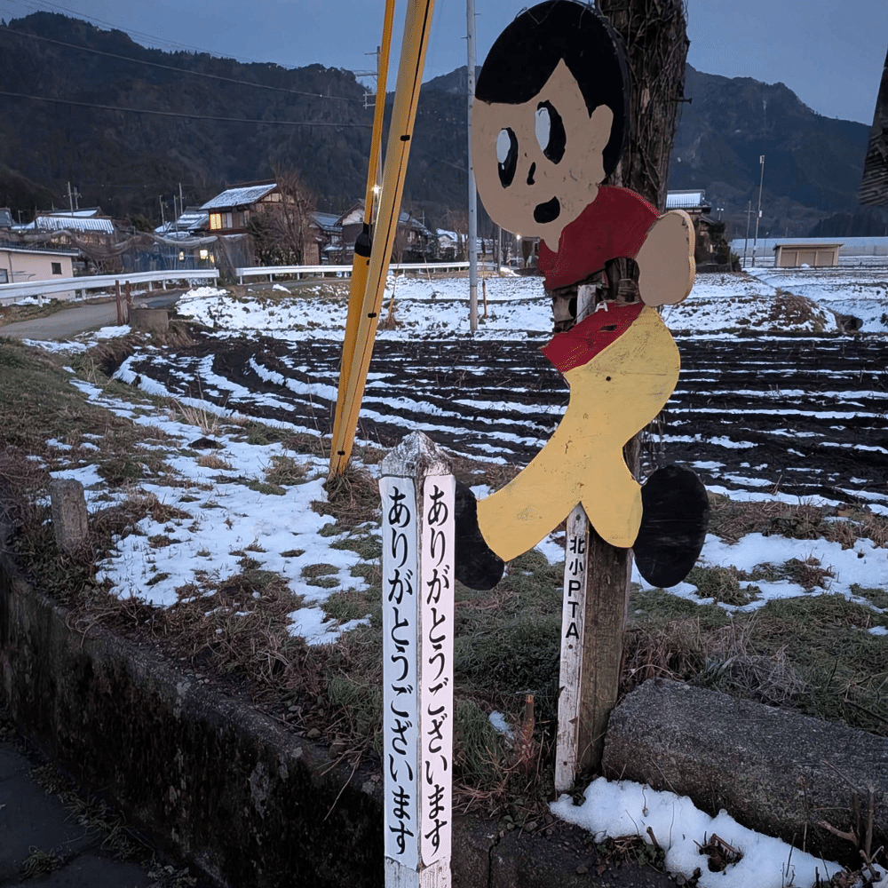 逃げるように山をあとにする。山のふもとには例のシールが全方向に貼られた石柱があった。なぜかはわからないが、近くにあった飛び出し坊やは体がねじ切れていた。
