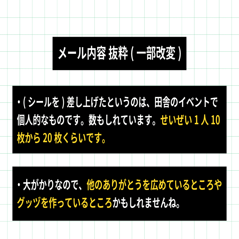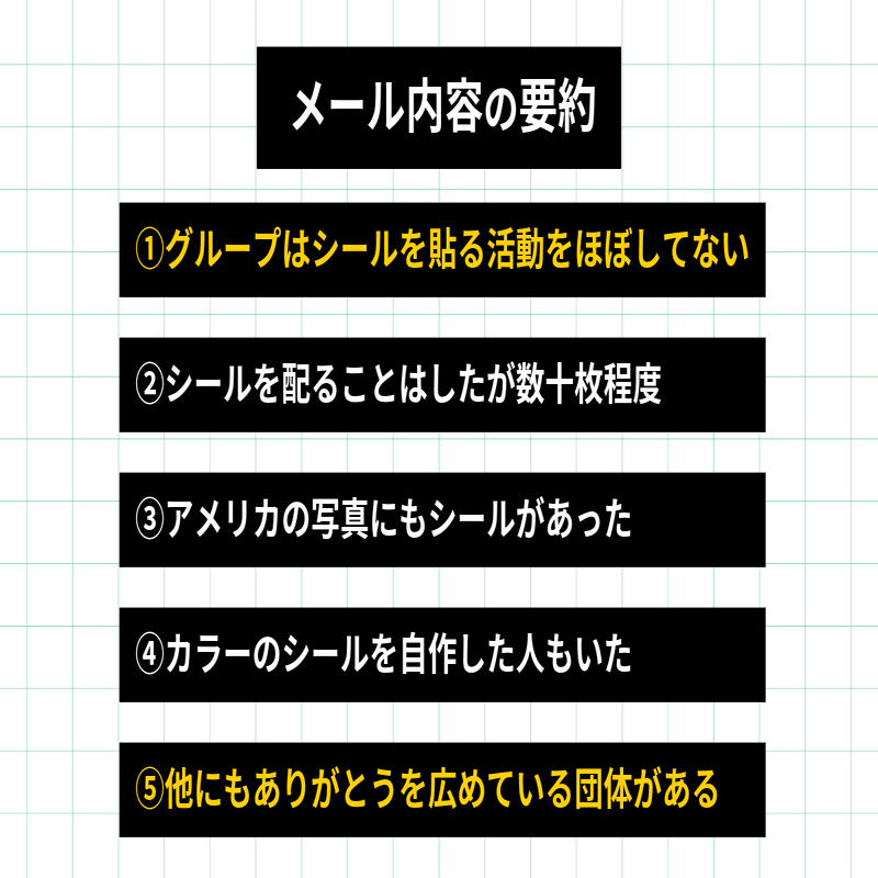 これらのスレッドやそこに貼られているリンクを調べ、追加でありがとうボランティアグループに質問をしていった結果、ありがとうシールを巡った一つのストーリーが浮かび上がってきた。