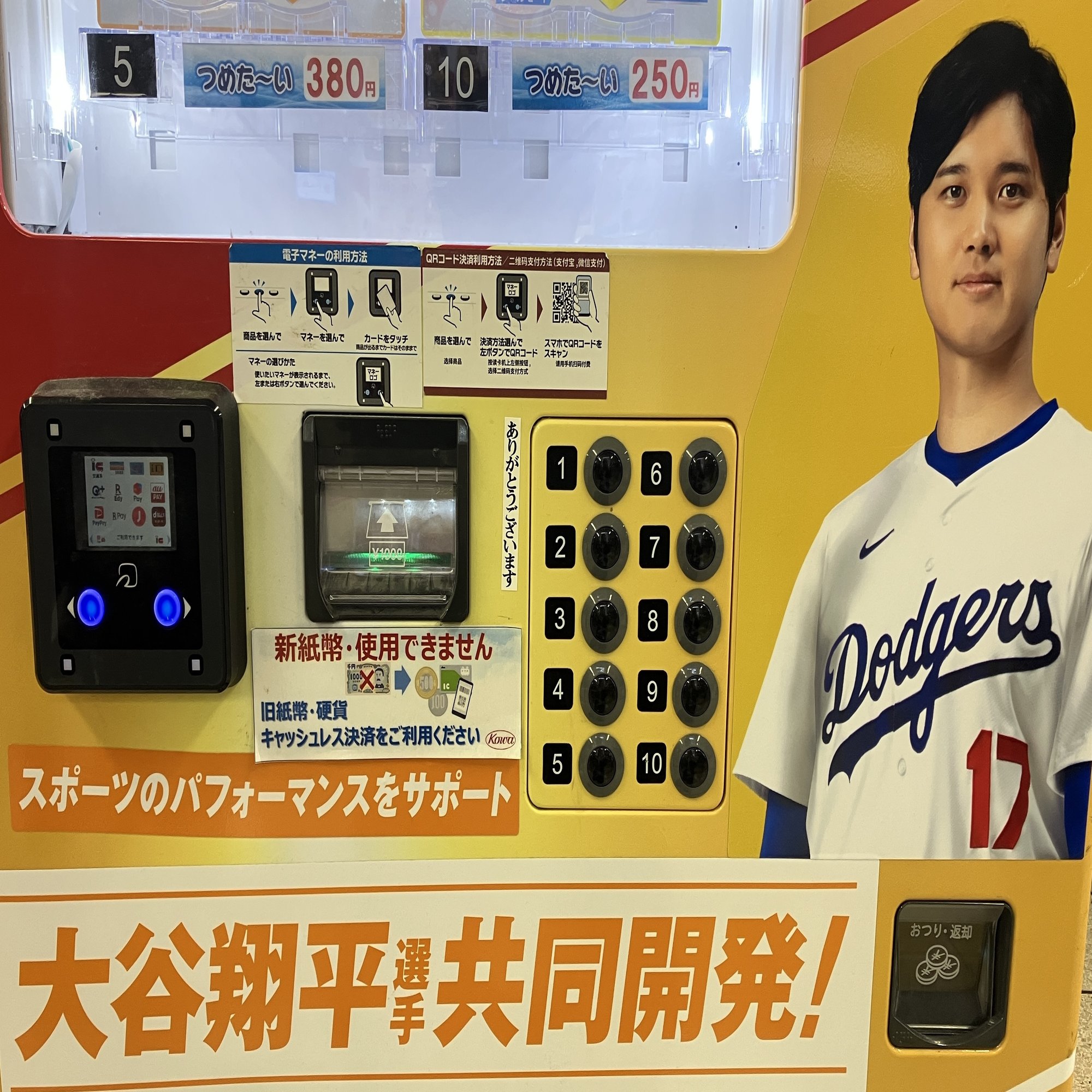 池袋で見かけた大谷翔平の自販機。着ているユニフォームはドジャース。嫌な予感。