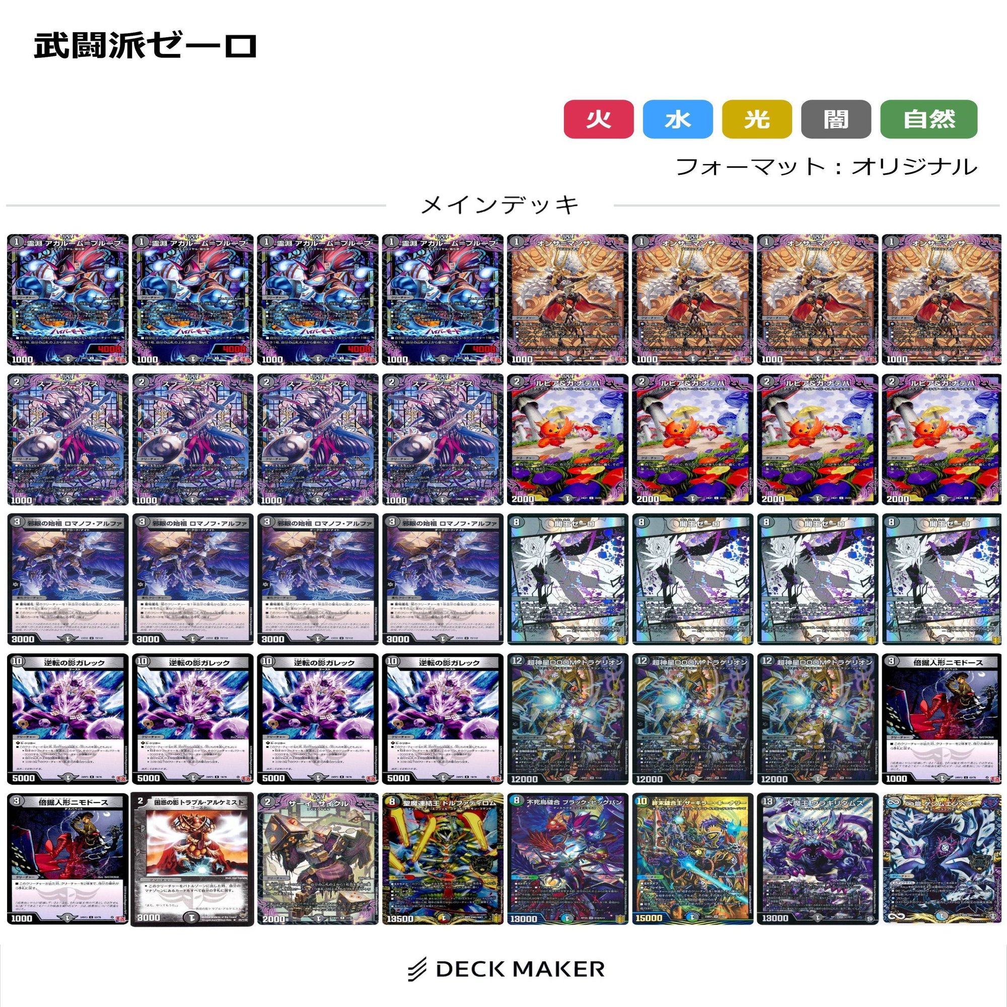 更に研究が進んで別にウラギリダムスがなくても何とかなる?可能性が出てきました。この構築では1ターンの間に有限のクリーチャー増殖ループを実行してドルファ、キナリ、ゲンムが下敷きのDOOMドラゲリオン(都合がいいとDOOMが2体)、ロマノフアルファ4体をそろえて殴って勝ちます。筆者は空いたスロットにドコータを積み込みました。