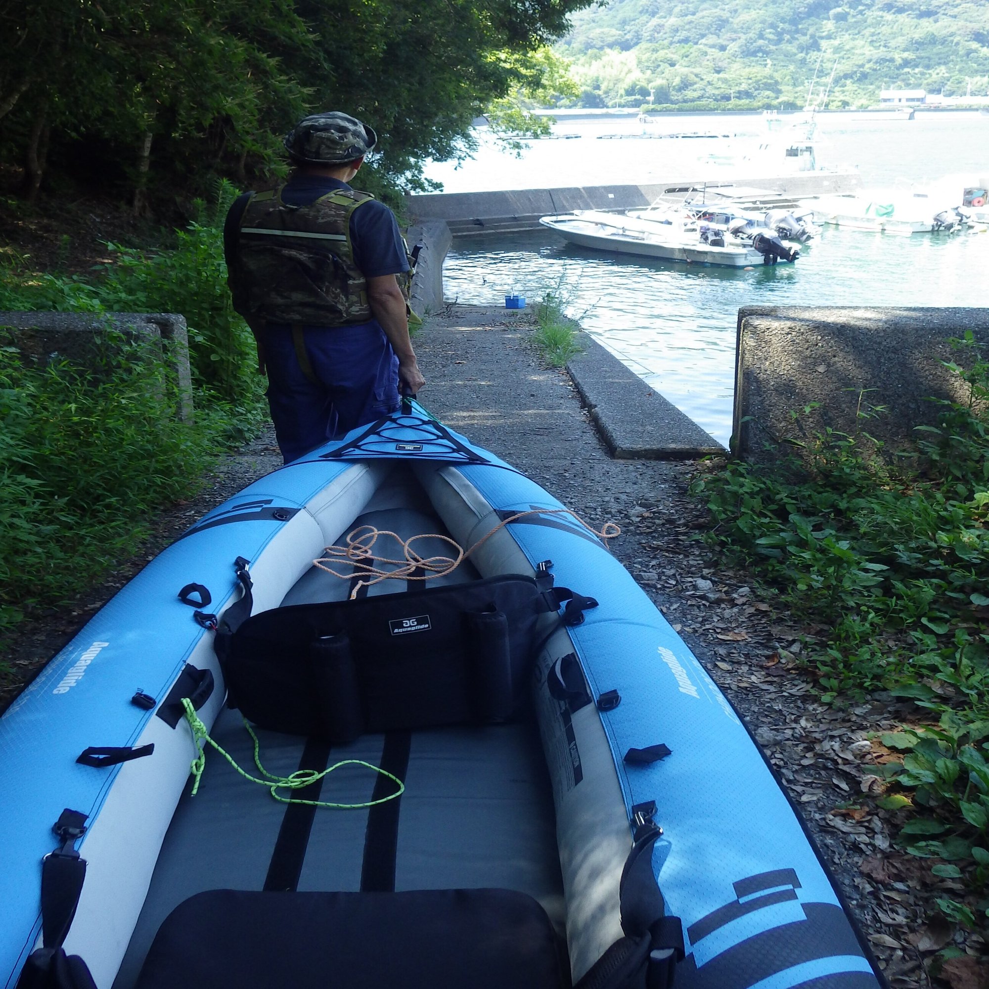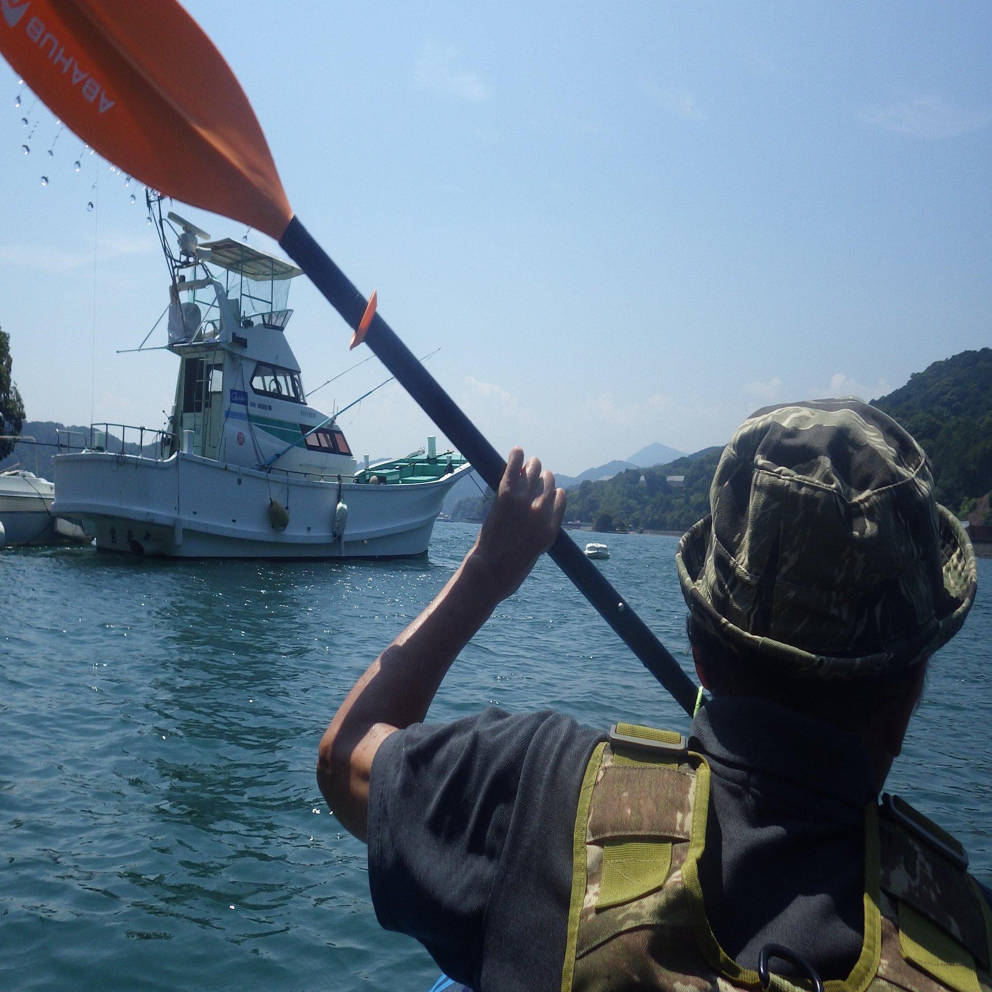 今回の調査には、友人のヒロシ君が協力してくれた。車で運んできたシーカヤックを降ろし、漁港のスロープを利用して海に浮かべた。目的地まで1㌔ほど。2人してパドルを漕ぎ、漁船が係留された港を出た。