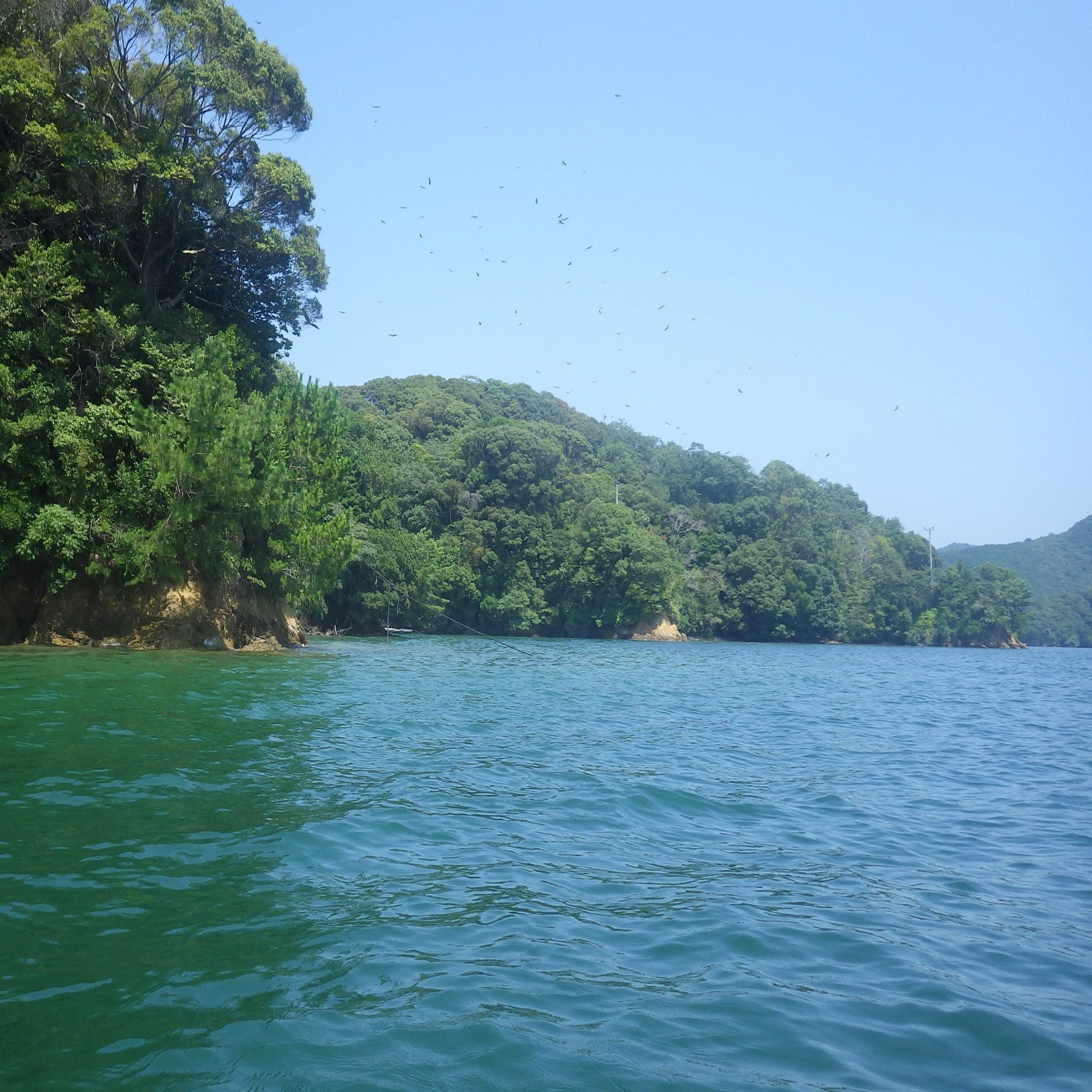 幸いにも風がなく、波高も1㍍を下回っている。東西約12㌔の細長い浦ノ内湾は典型的な内海だし、対岸までは約1㌔しかない。もし流されても、岸には着くのだ。これが外海なら大事である。いい年をしたオッサン2人が漂流すれば、遭難してサメの餌食になるだろう。