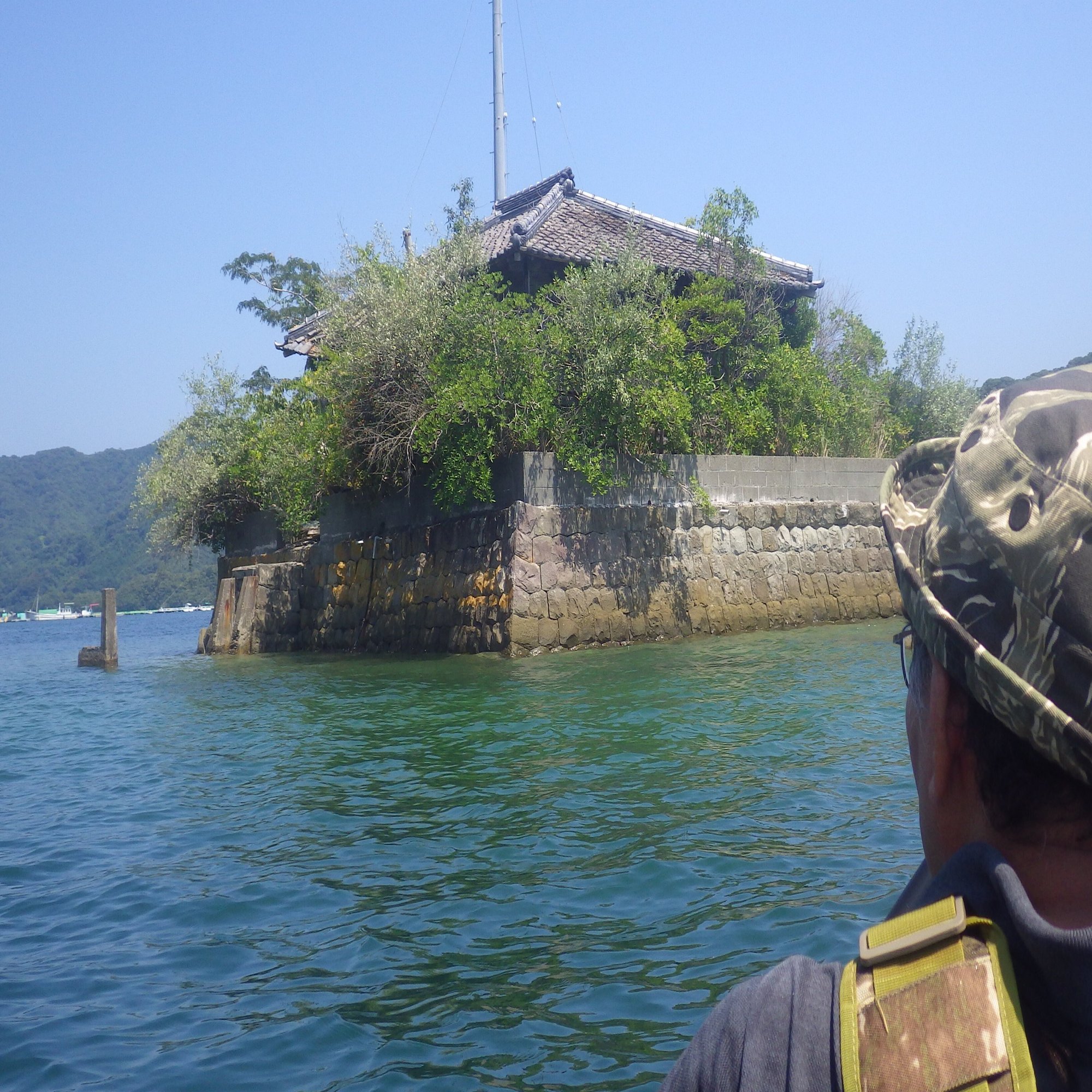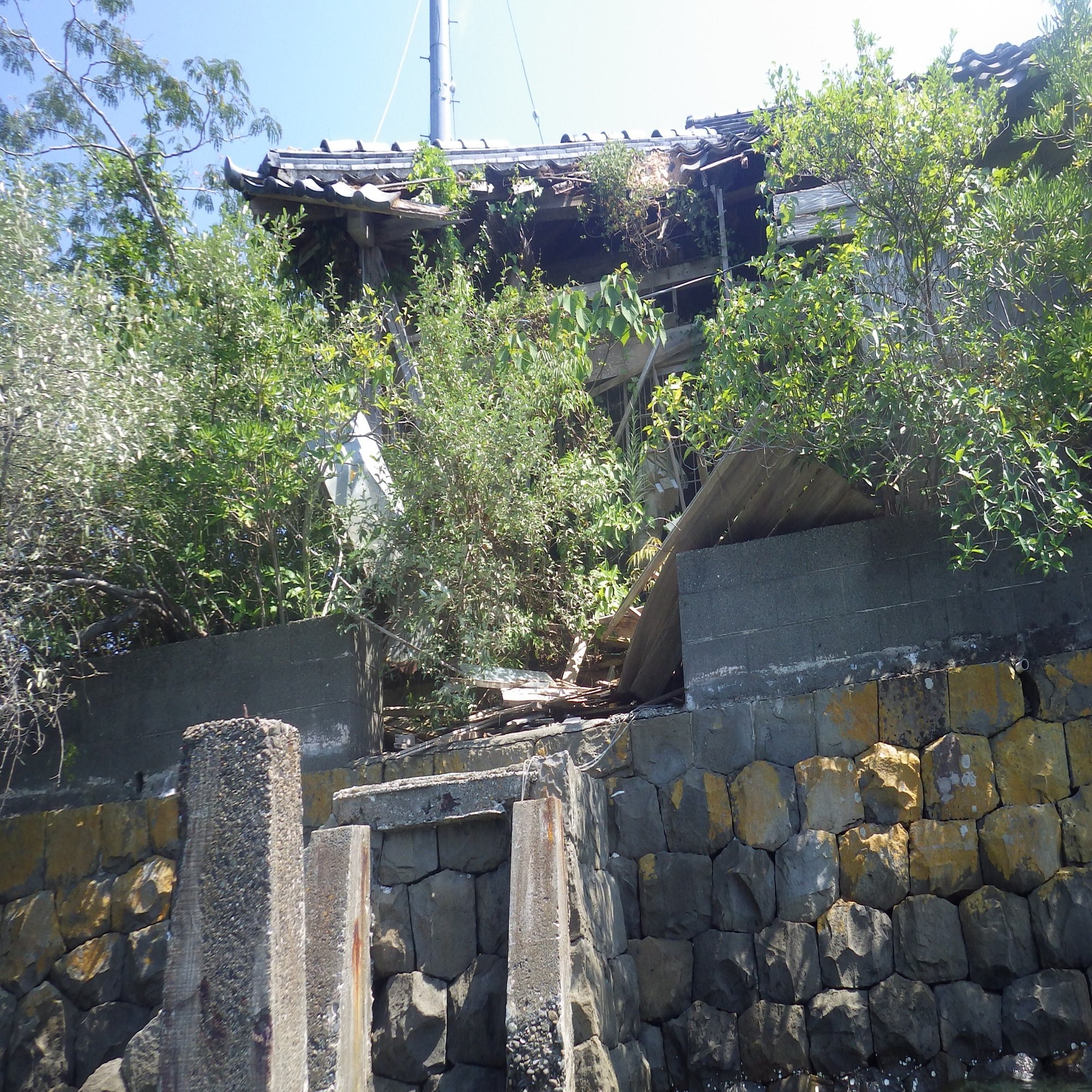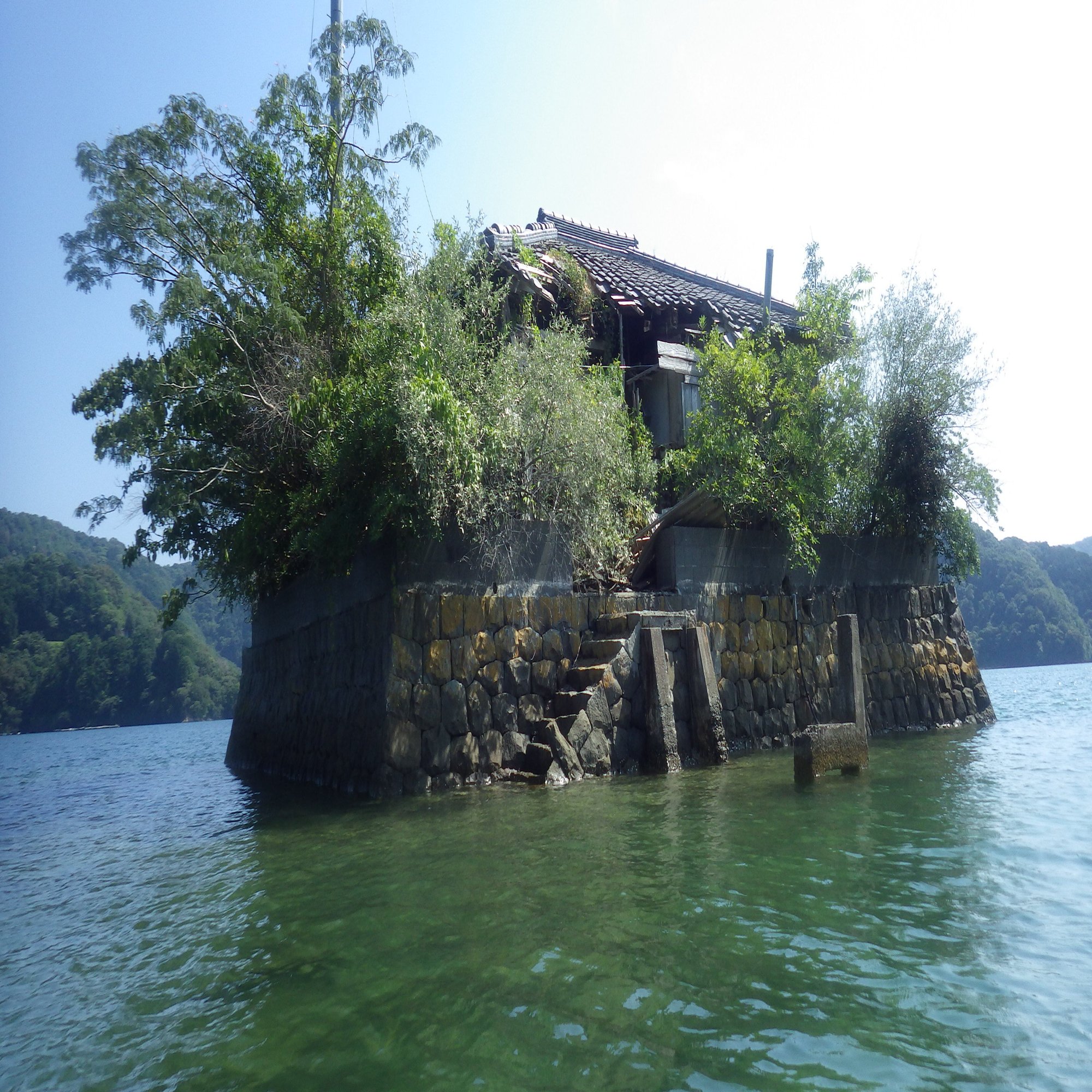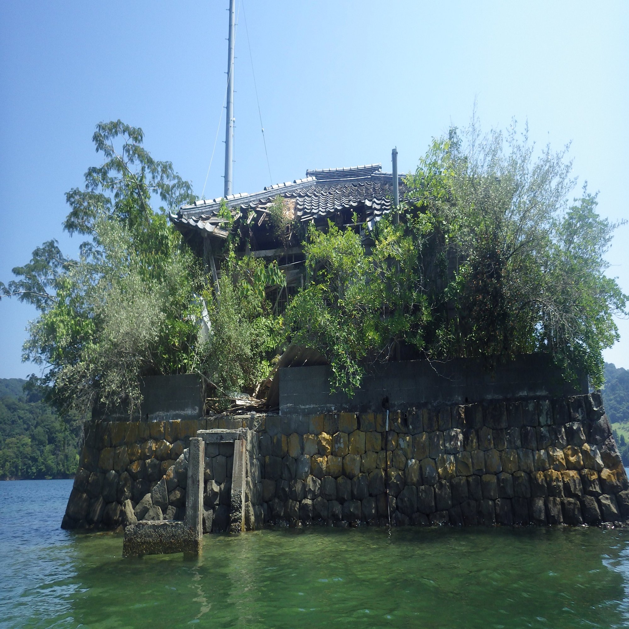 海の上に廃屋が浮かんでいる。石垣で囲まれた敷地には、たくさんの木が茂っている。陸地から100㍍以上も離れているが、橋は見えない。ここは完全に孤立した島なのだ。