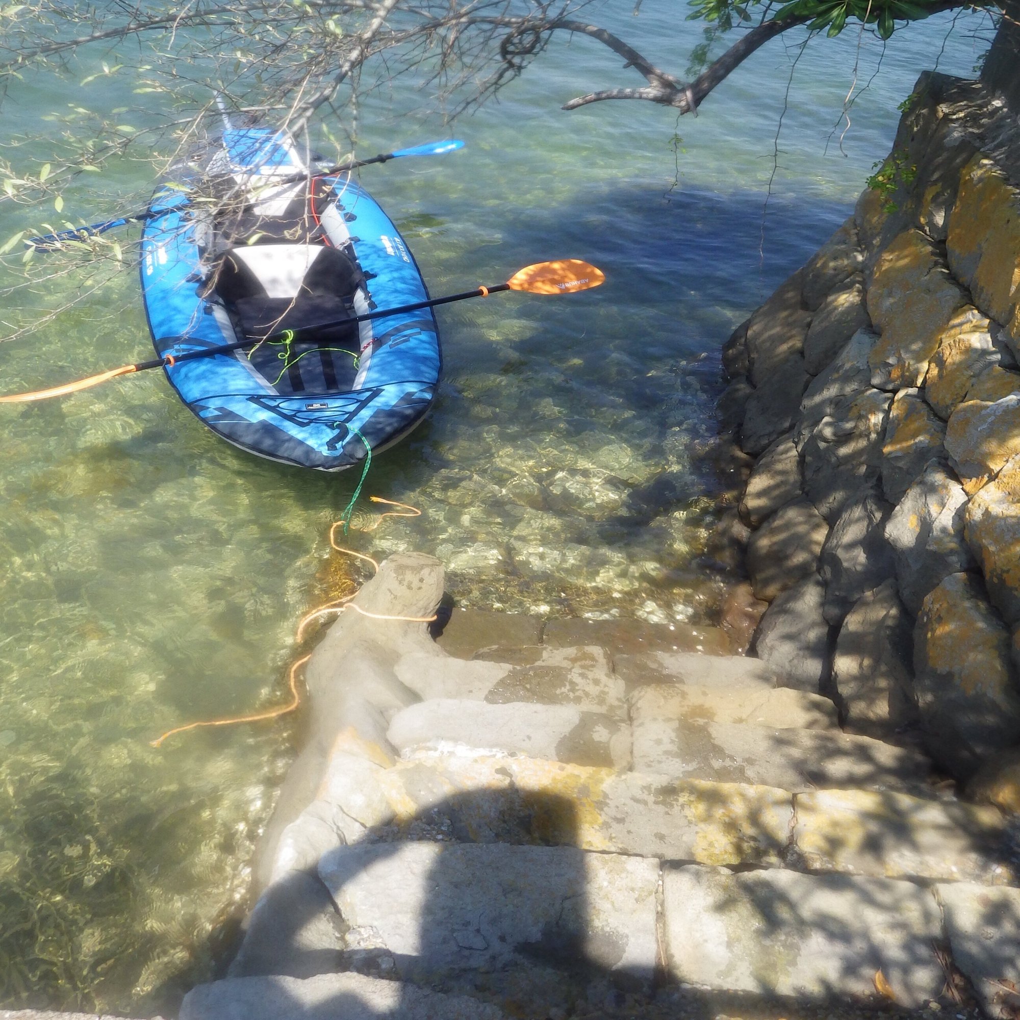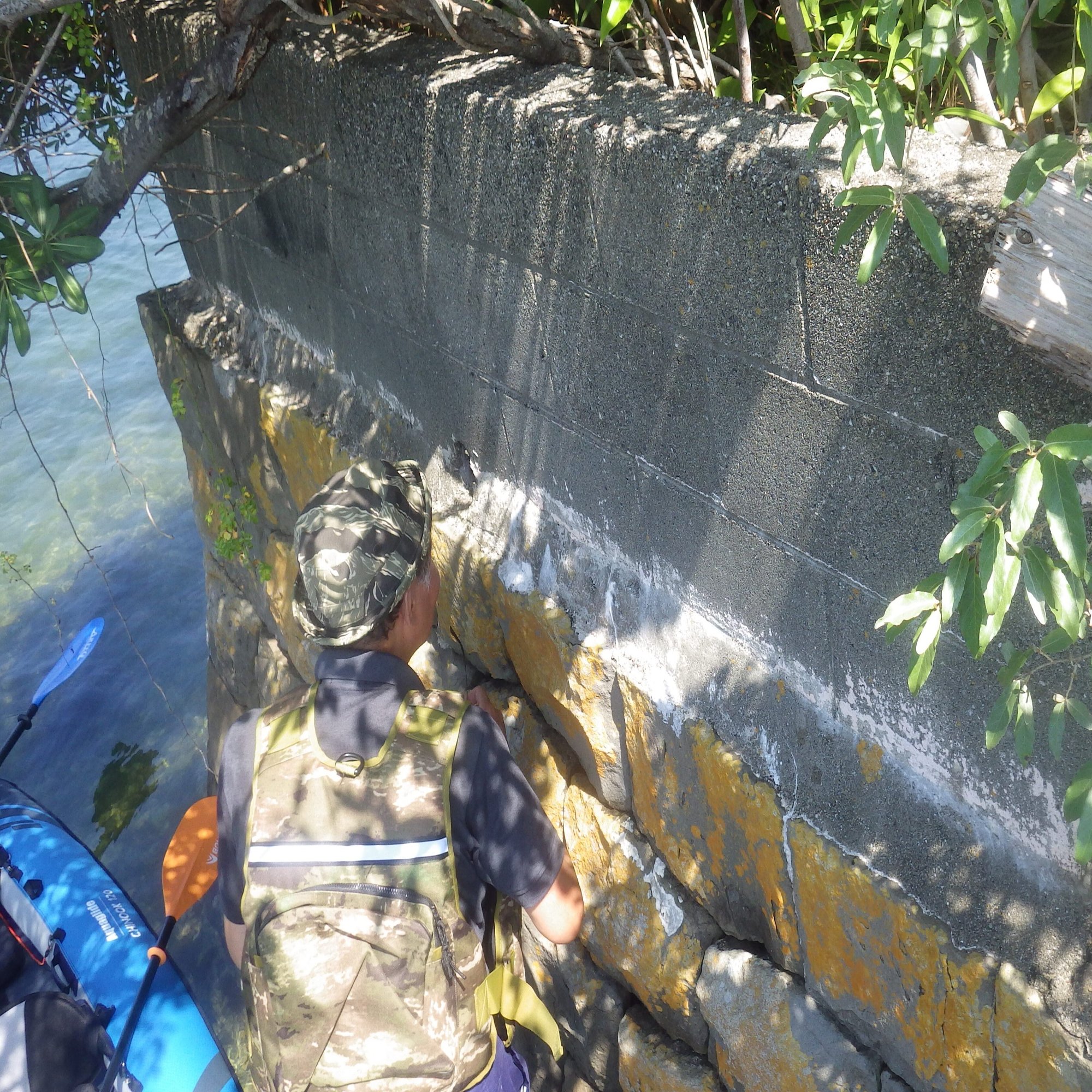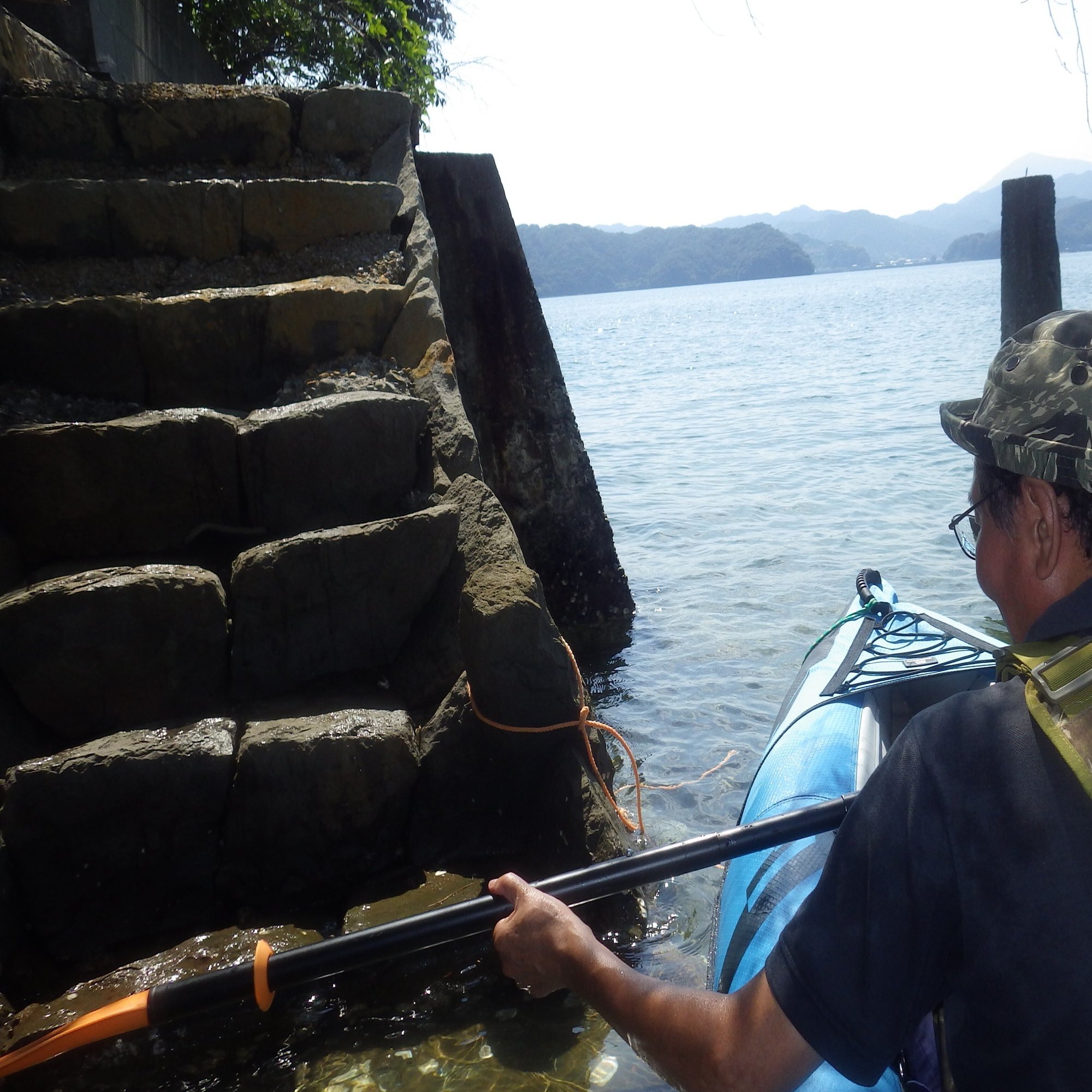 カヤックを降りると、水はひざの上まで達した。足を踏み入れた階段の下部には、カキ殻が張り付いている。カヤックが流されないように、船体につないだロープを石垣に縛りつける。いよいよ、謎の島への上陸だ。