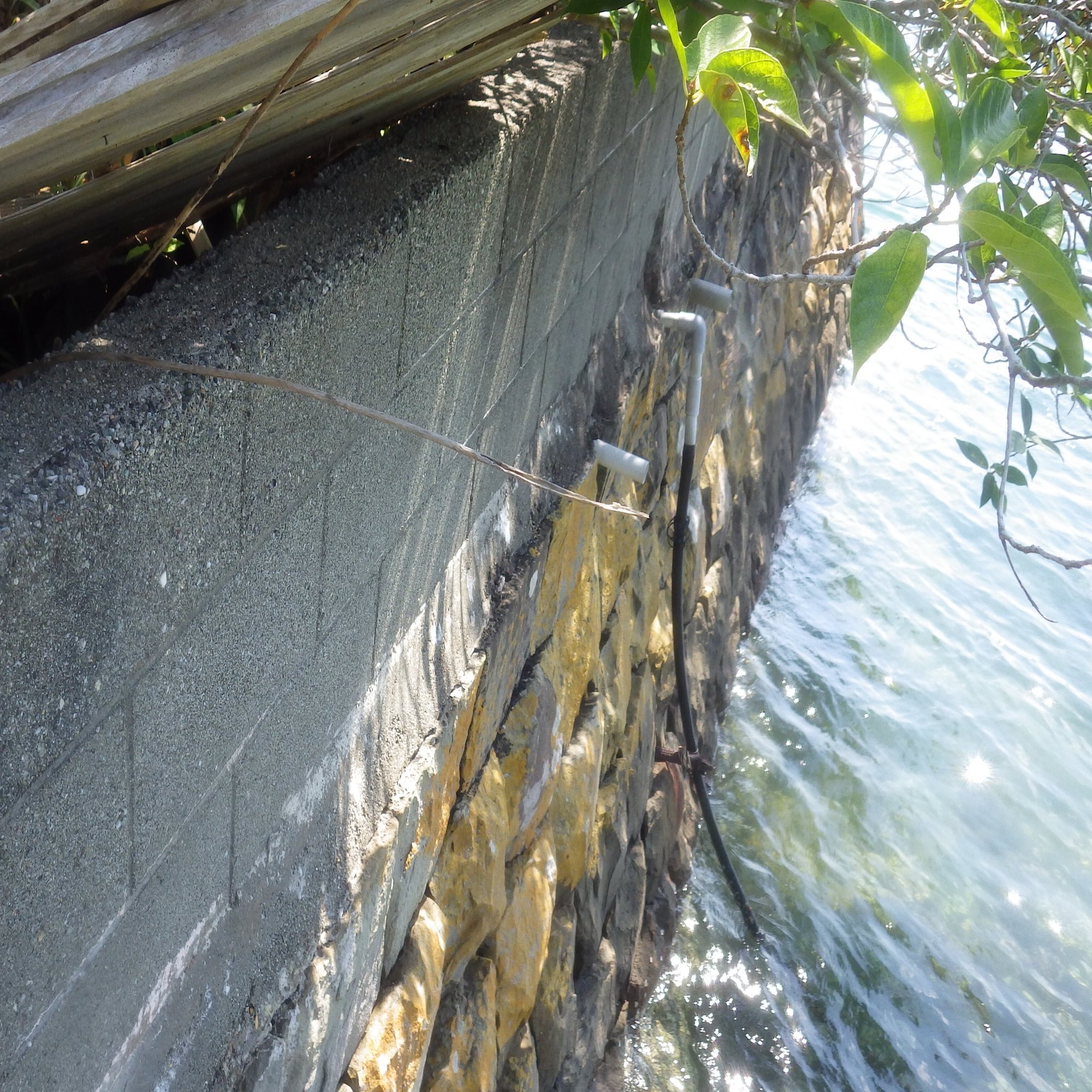 海に面した石垣を観察したら、排水のためと思われる3本のパイプが突き出していた。しっかりとした建物にトイレと風呂場。以前、電気が供給されていたのは間違いない。これで水道が引き込まれていたら、生活に不自由はなかっただろう。