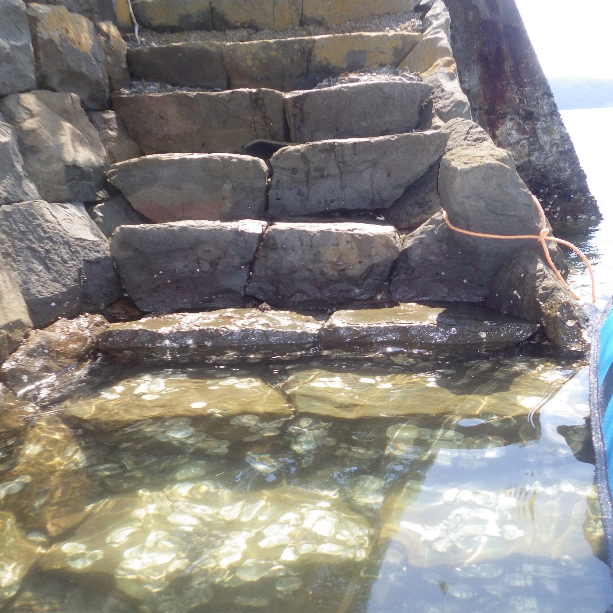 形からすると、桟橋の基礎部分だろうか。ちょうど満潮を迎えていたため、階段の近くに接岸した。