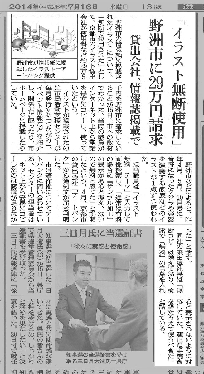 その後、使用料の支出について野洲市議会で討議され、市議会の議事録に載った市の関係者と僕のコメントが、2014年7月15日付の京都新聞に掲載された。