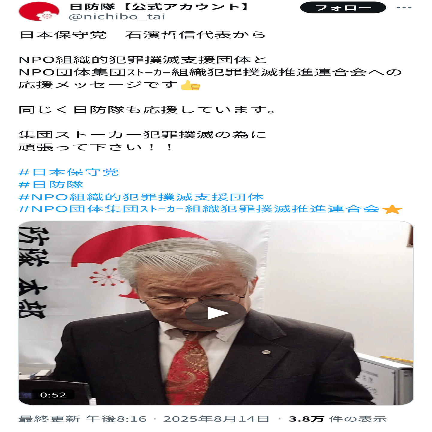 2025年8月には、反ワクチン系極右団体で川口のクルド人排斥運動にも関わっている日防隊と交流、石濱哲信代表による応援メッセージまで送られました。これもウォッチャー的には衝撃の絵面です。