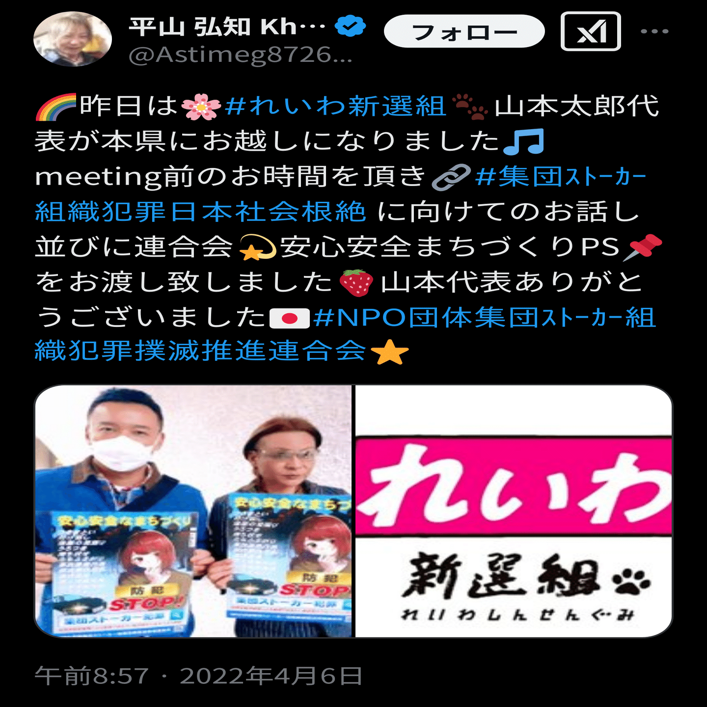 平山は元々れいわ新選組の支持者だったようで、ボランティアスタッフとして参加している他、2022年4月は山本太郎代表と面会し「あのポスター」と共にツーショットを撮っていました。なかなかパンチのある絵面です。