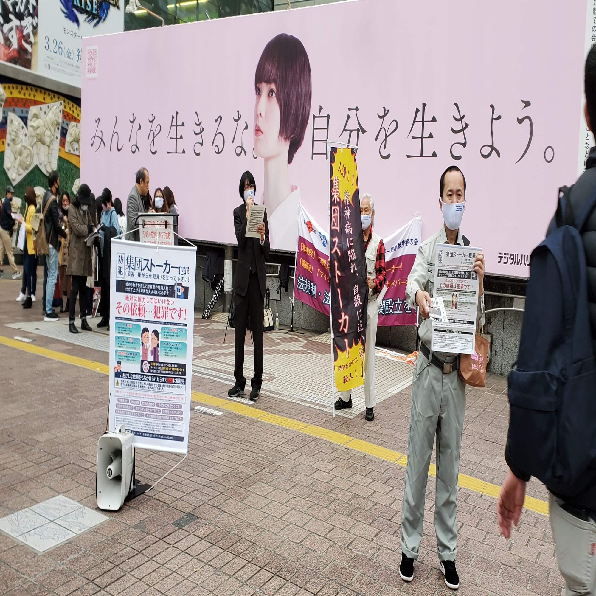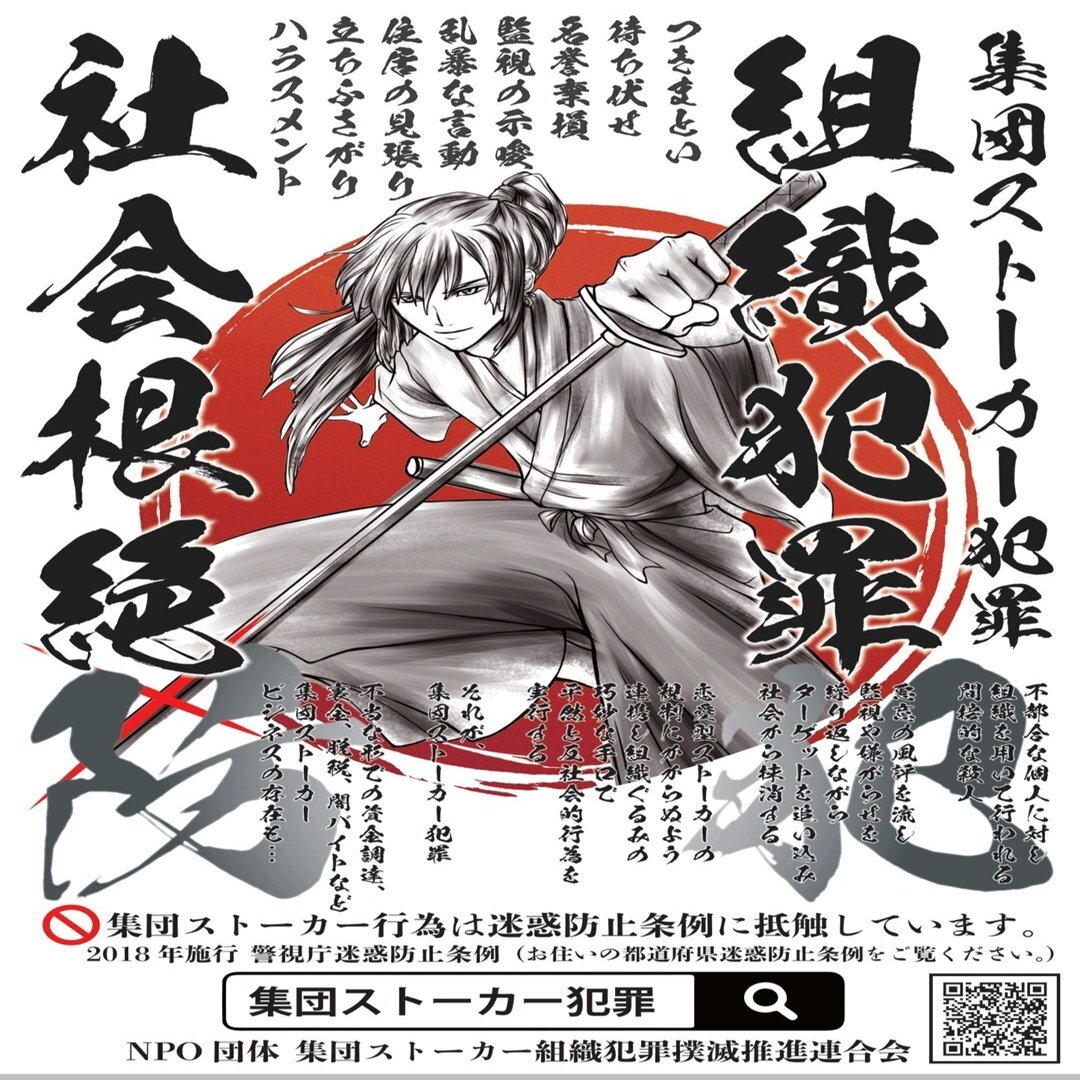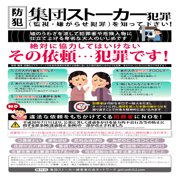 ポスターに記されている「集団ストーカー」とは、特定個人に対し複数人が組織的に日常生活を妨害する嫌がらせを指します。外出すると必ず何者かに付きまとわれる、特定の時間やタイミングで声をかけられるなどといった内容が多く、大抵の場合、電磁波を脳に照射して思考をどうのこうのするという「テクノロジー犯罪」とセットで語られます。
