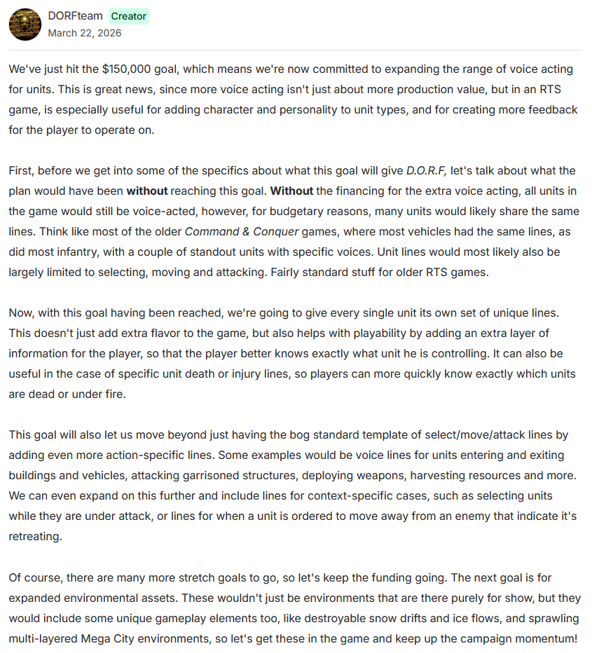quarter of the way there on day one so here's hoping they can at least get to full voice acting, will probably toss some money their way next paycheck