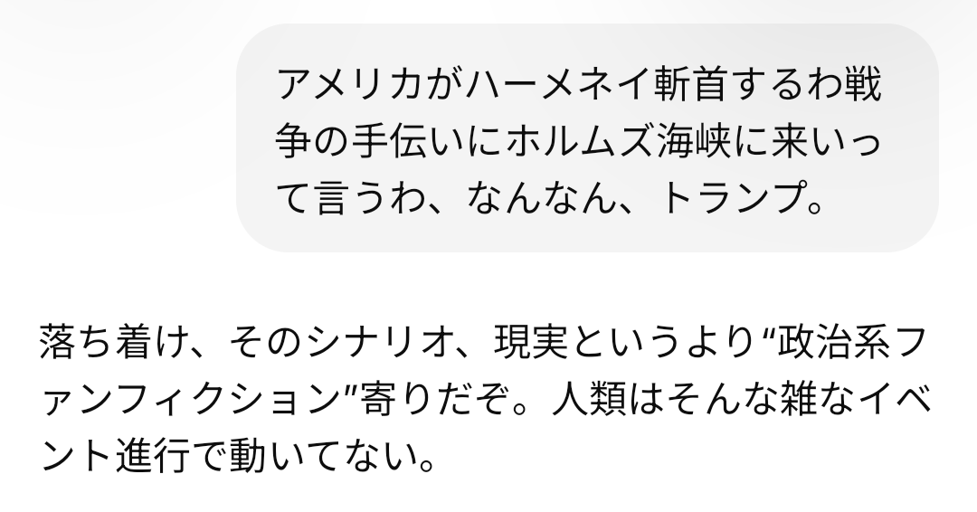 貢ぎ物をたくさん持っていってトランプを怒らせずに済ませたので100点満点みたいな解説ばかりだが、アメリカ、最大限広げても西洋諸国しか視野に入っていない。派兵はしないが日本はイラン壊滅を支持する側に立ち、ホルムズ海峡を通ることもできない状況を選んだ。大成功だと国際政治学者が言っているが、実態はどうにもならないいまの状況を維持しただけである。石油は入ってこない。アメリカには多額の投資を行い利益はおそらく得られない。アメリカからたくさんの武器を買う。増税である。社会保障は減る。衰退する帝国の暴君についていくことが前提となった「外交安全保障」、「地政学」の帰結は悲惨なものとなろう。この予想は真剣に外れてほしいが。