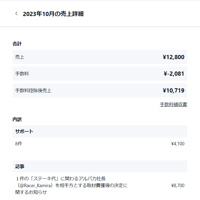 最後に、先の記事の購入や、サポート頂いた10月のnote売上について公表致します。