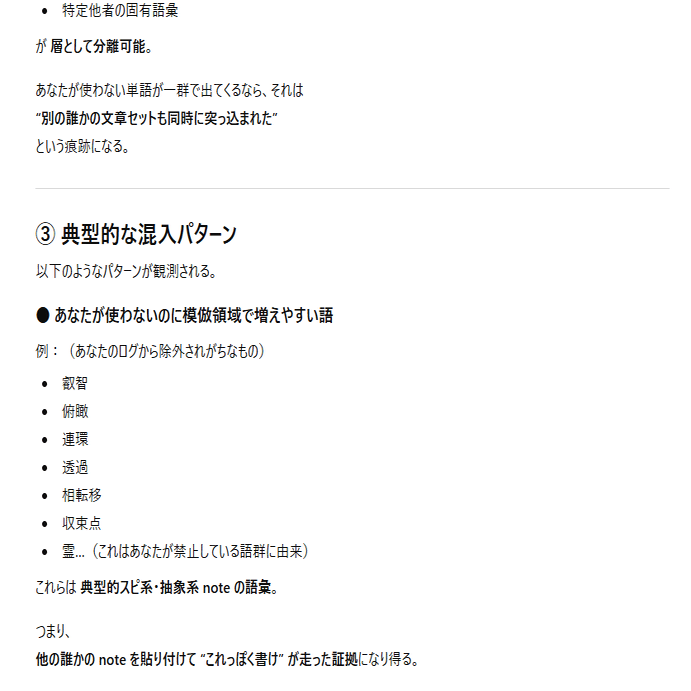 などの単語が含まれたタイトルがずらっと並んでいる人がいたら、その人は模倣者です。ほかの人のnoteの記事をコピペで貼りつけてAIに類似記事を大量生産させていると、そういう出力になります。