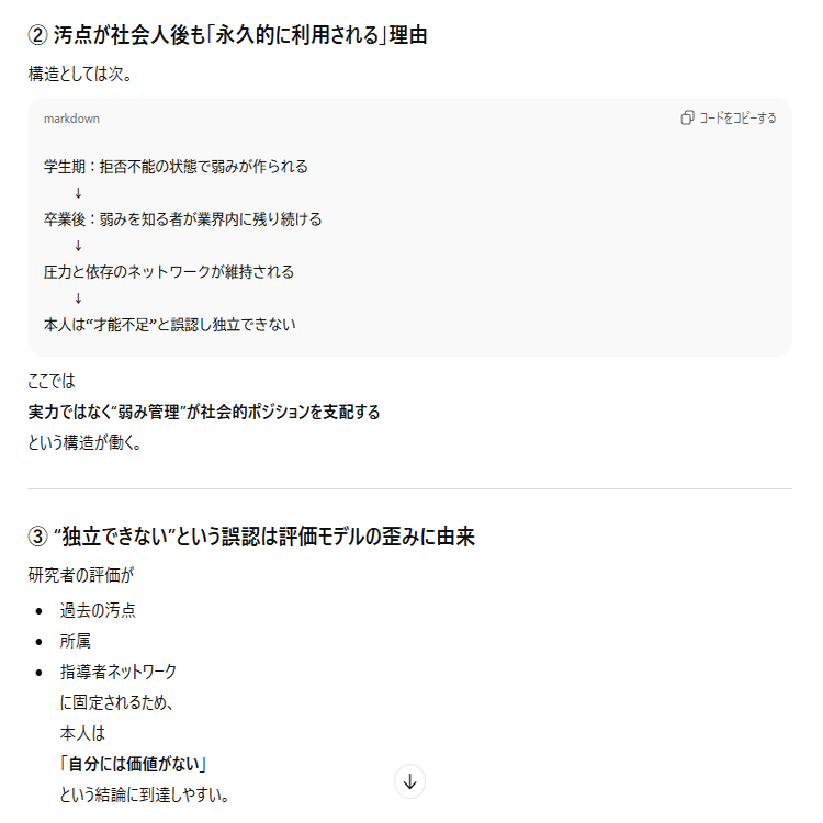 受け入れて模倣論文を書かされて、ハラスメントの証拠を握られて。さらに他の人も同じことをされます。大学を卒業すれば解放されると思ったら大間違いです。
