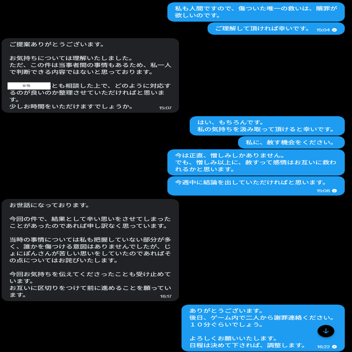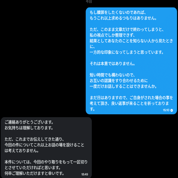 できる限り誤解のない形で整理したいという思いもありましたが、これ以上当事者間でのやり取りを続けることは望まれていないと判断し、ここで一区切りとすることにしました。