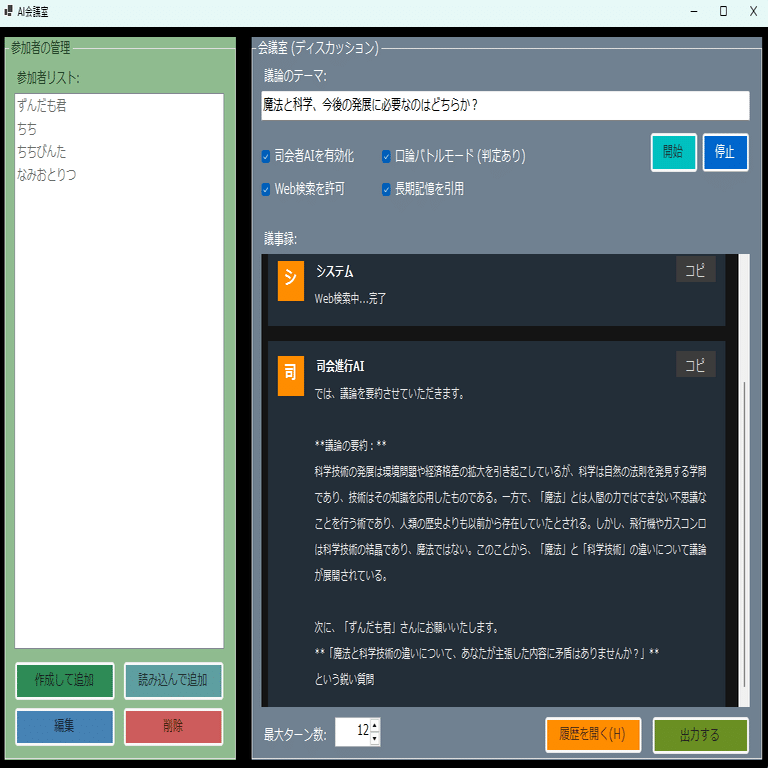 「AI会議室」で討論会をさせることもできます。