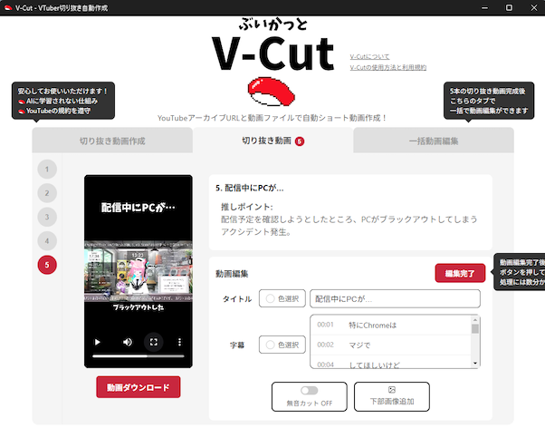 ④ V-Cutを起動してURLをペースト&動画ファイルを選択して「作成開始」ボタンを押す