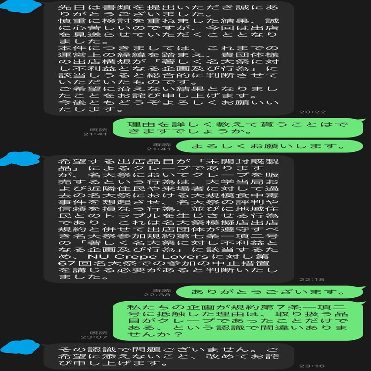 NU Crepe Lovers様が過去に大学側と協議を重ねてこられた事実につきましては、私どもも承知しております。また、前年度以前にも名大祭における「クレープの提供」が認められなかったことに対し、不当であるとしてご主張されてきたことについても把握しております。