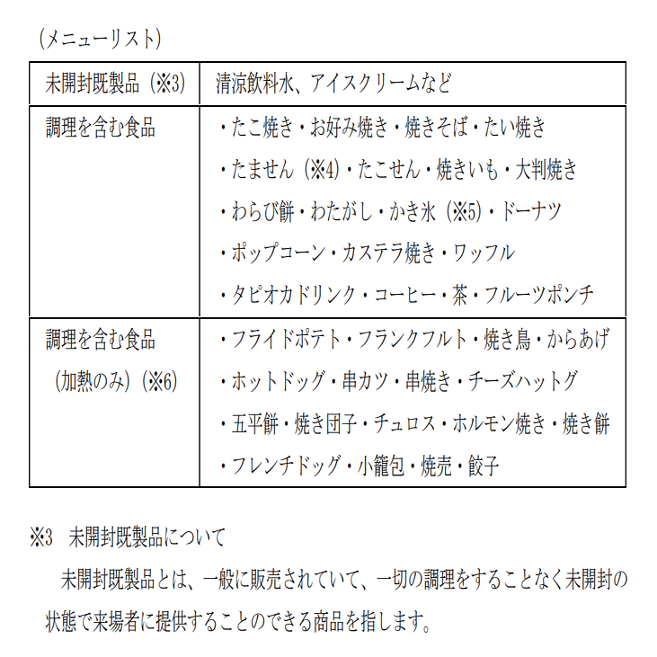 名大祭の模擬店出店要項では、取り扱う食品について、「調理を含む食品」と「未開封既製品」とに分けられています。