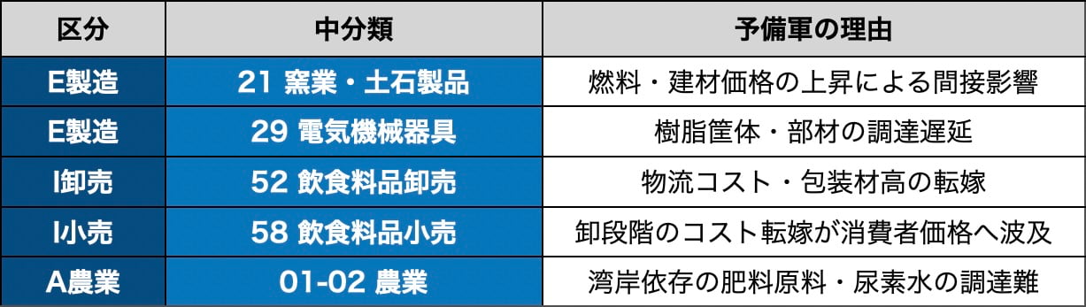 次に来る波も見えている。上の表には入れていないが、以下の中分類は間接影響が顕在化しつつあり、予備軍として監視が必要だ。