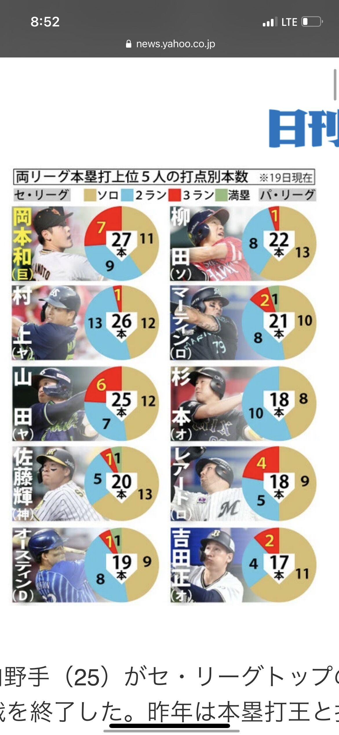今季の前半戦は両リーグで合計902本塁打だったが、そのうち3ランは93本で全体の10・3%。20年は1288本のうち166本で12・9%、19年は1688本のうち167本で9・9%と、3ランが全本塁打に占める割合は10%前後しかない。岡本和が3ランを2桁に乗せられるか、後半戦を楽しみにしたい。【記録室】